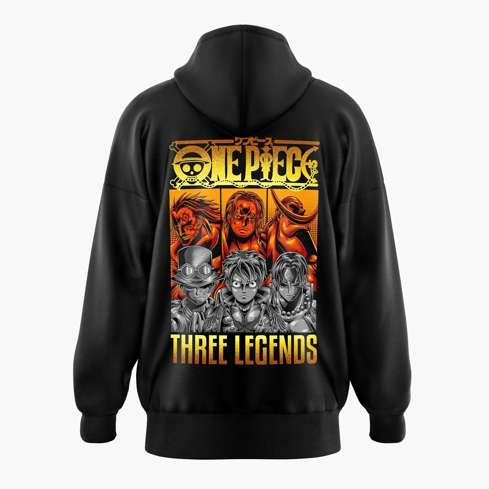 Embark on an unforgettable journey with our exclusive "One Piece 3 Legends" Oversized Hoodie, a visual masterpiece celebrating the legacy of Dragon, Shanks, and Whitebeard. Boldly written "One Piece" at the top introduces a stunning composition in fiery hues. Below, Sabo, Luffy, and Ace stand united in greyscale, highlighting their interconnected destinies. "3 Legends" at the bottom encapsulates the indomitable spirit of brotherhood and the epic tale of the Grand Line.