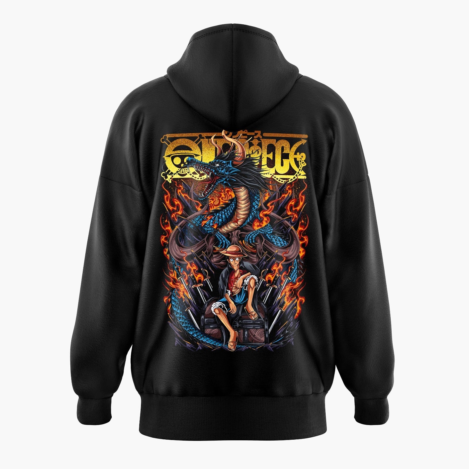 Embark on a Pirate's Quest with our Monkey D Luffy Premium Oversized Hoodie, a visual masterpiece capturing the essence of piracy and adventure. Luffy, seated atop a treasure chest surrounded by swords, dons a fierce expression, embodying the spirit of a true pirate king. In the background, the imposing figure of Kaido in azure dragon form adds a sense of foreboding. At the top, "One Piece" is boldly written in fiery colors, setting ablaze the aura of this premium hoodie.