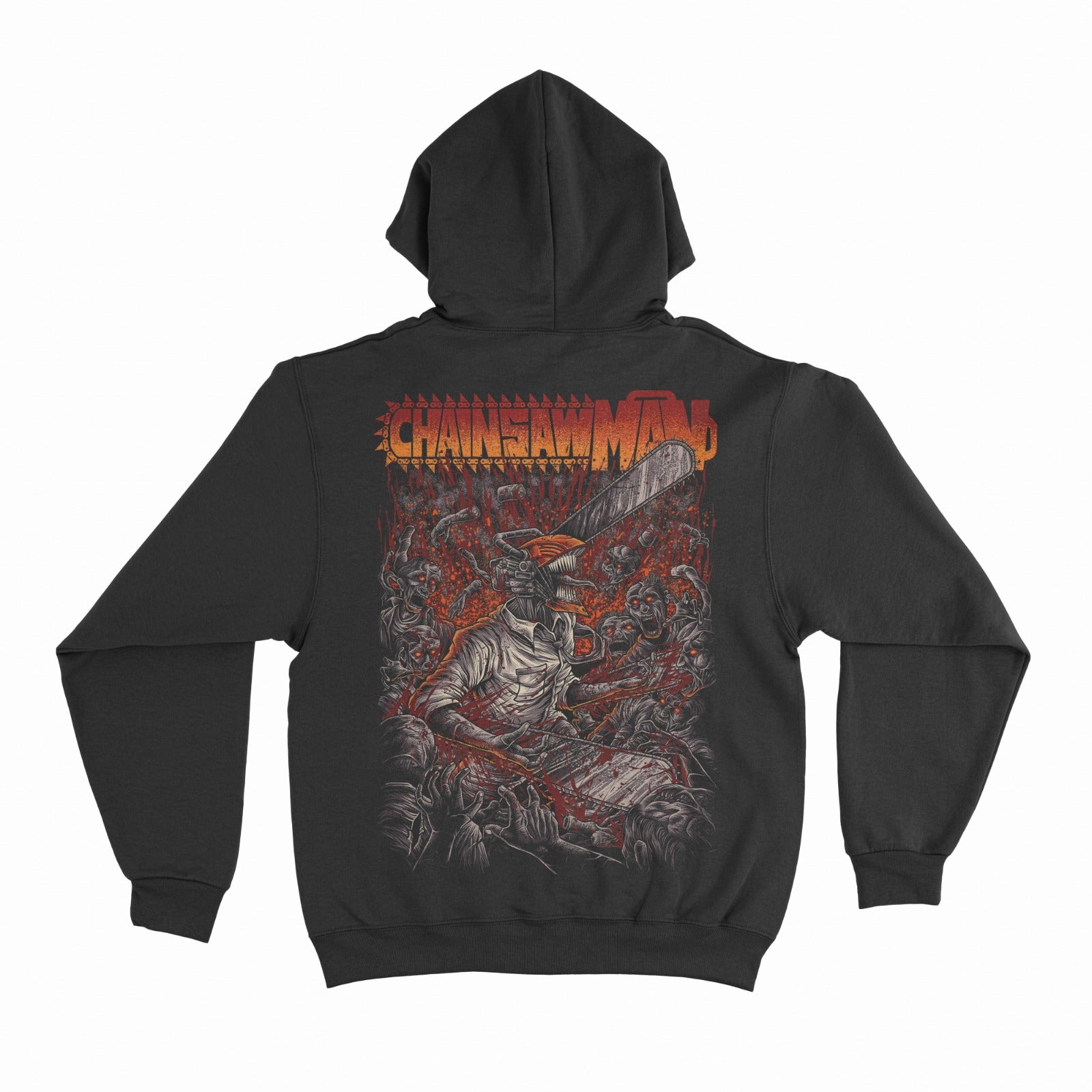 Embrace the chaos with our Black Chainsawman Unleashed Hoodie, featuring an intense back design of Denji in his Chainsawman form, splattered with blood, and surrounded by a horde of menacing zombies. This electrifying portrayal captures the raw power and relentless energy of this iconic manga character.