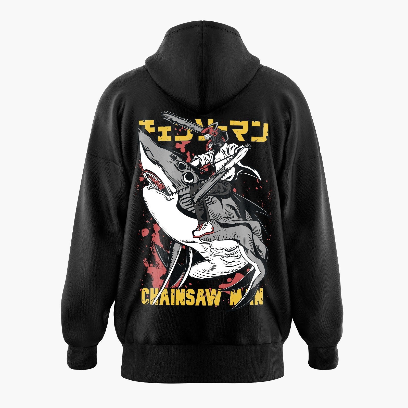 Embark on an electrifying journey into the world of Chainsawman with our exclusive Denji Riding Beam Black Oversized Hoodie. Featuring a mesmerizing black and white image of Denji in his Chainsawman form, riding atop Beam in his shark manifestation, this premium hoodie captures the dynamic partnership between the duo in their pursuit of devil-hunting glory.
