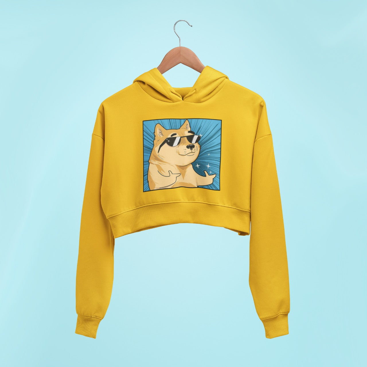 Elevate your style with our Yellow Crop Hoodie, featuring a fun and trendy front design of the "cool doge" wearing uber cool black shades and striking a swanky pose by pointing with both fingers. This hoodie is the perfect addition to your wardrobe, combining comfort and a touch of humor with a fashionable edge.