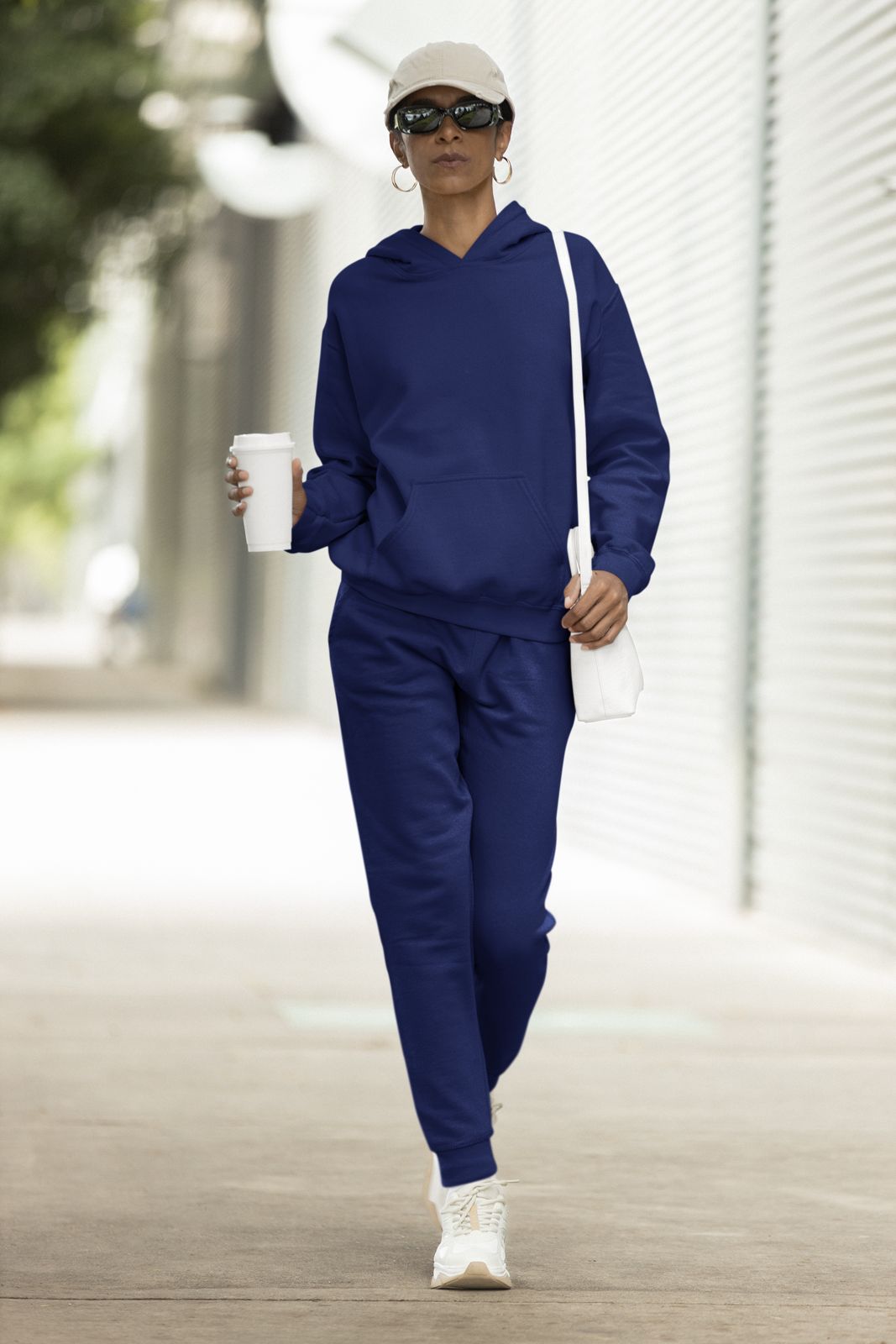 Accompanying the hoodie, our navy blue joggers offer a modern silhouette designed for your on-the-go lifestyle. Tailored for both style and comfort, these joggers effortlessly fuse athleisure aesthetics with practicality. Whether you're tackling your daily to-do list or simply unwinding, the "Daily Essentials" co-ord set in navy blue is your ticket to versatile fashion that lasts from sunrise to sunset.
