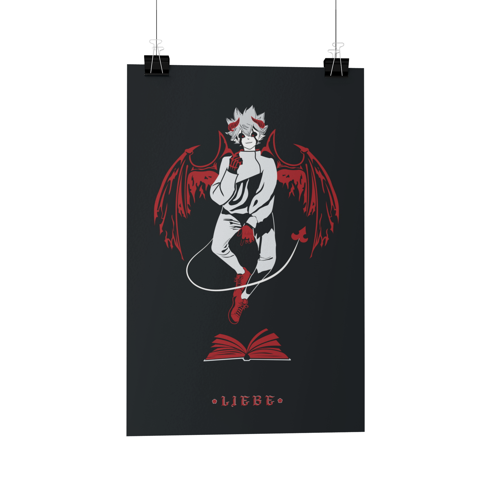 Prepare to be enchanted by our A4 Black Clover Poster - Featuring Liebe! Step into the mesmerizing world of Black Clover with this breathtaking A4 poster. Behold Liebe, the majestic white-colored demon, hovering majestically over a vibrant red grimoire, adorned with fiery red wings and horns. With Liebe's name elegantly inscribed in a matching crimson hue, this poster captures the very essence of Black Clover in all its mystical glory.