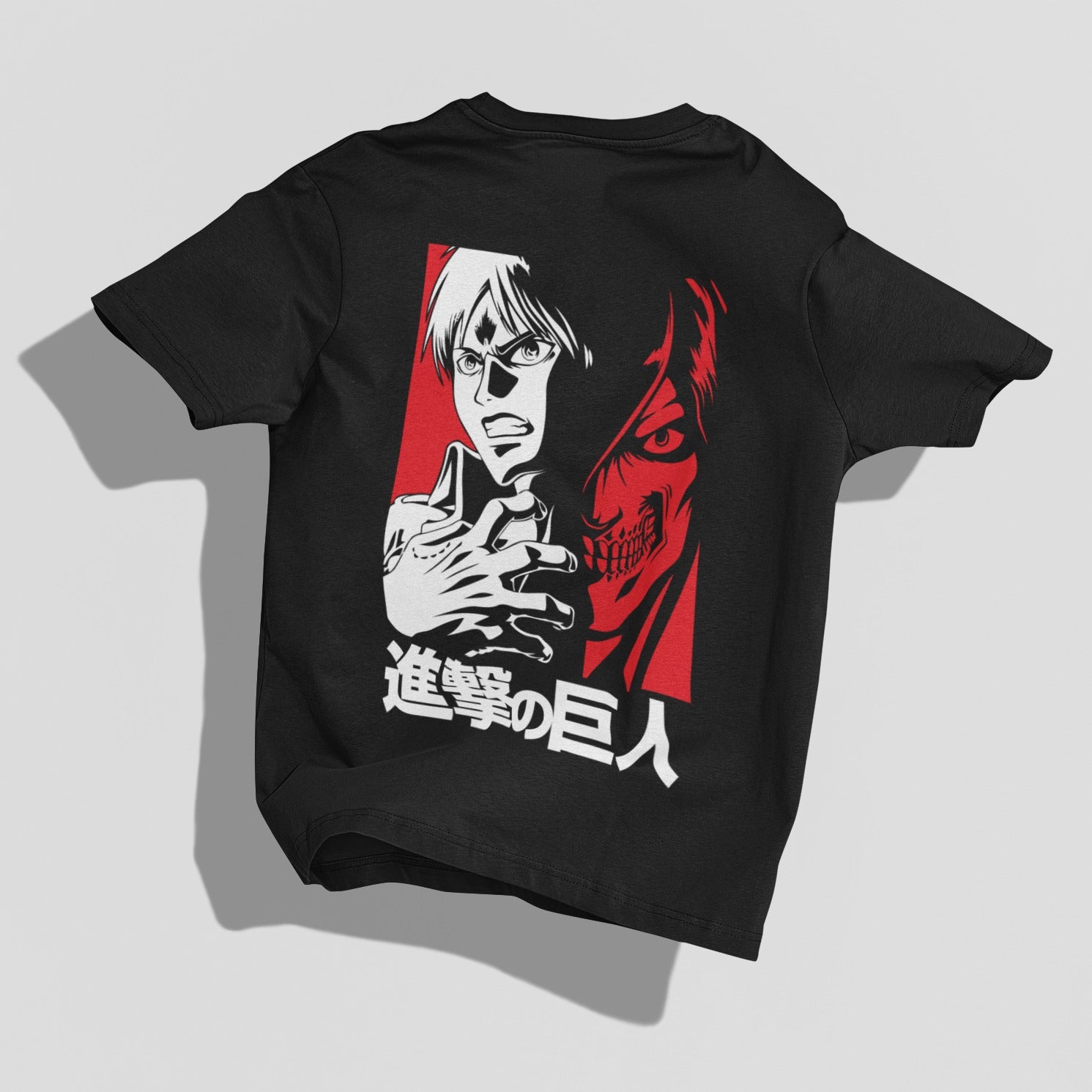 Eren's titan form, depicted in bold white and red, radiates anger and determination, adding a raw edge to your ensemble. The black canvas enhances the intensity, making this tee a must-have for fans who seek both comfort and a nod to the iconic Attack on Titan series.