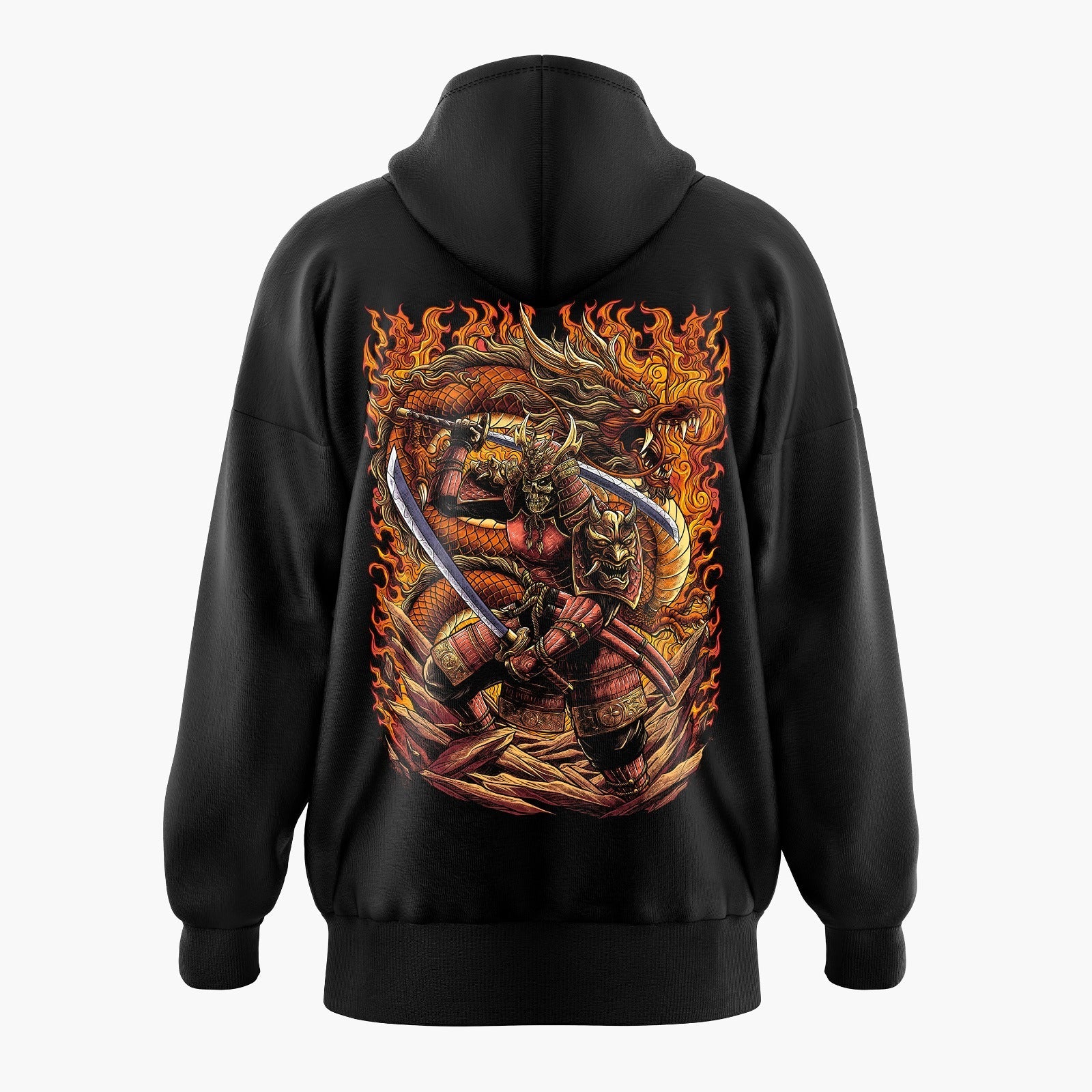 At the heart of this hoodie is the awe-inspiring depiction of a samurai adorned in full red armor with exquisite gold highlights. The intricate details showcase historical accuracy, while the vibrant color palette adds regality to the design.