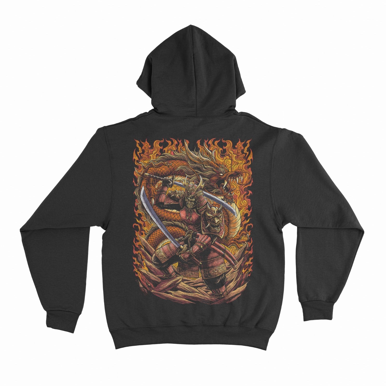 Crafted with meticulous attention to detail, this hoodie isn't just apparel; it's a portal to an era of mysticism and honor. The striking black canvas sets the stage for the intense imagery of the samurai, surrounded by flames and accompanied by a fired-up dragon, evoking the essence of ancient legends.