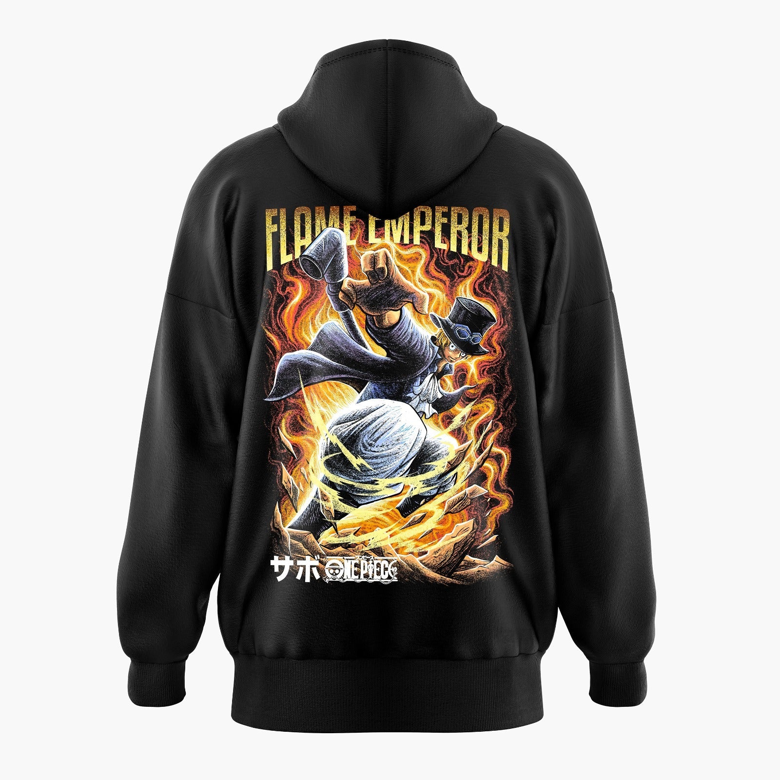 Embark on a fiery journey with our Sabo Flame Emperor Oversized Hoodie, epitomizing the Chief of Staff of the Revolutionary Army's indomitable spirit. The back design captures Sabo in a dynamic attack stance, encircled by roaring flames, poised to unleash his Dragon Claw Technique. Japanese characters elegantly spell "Sabo" at the bottom, completing a hoodie that embodies revolution and strength.