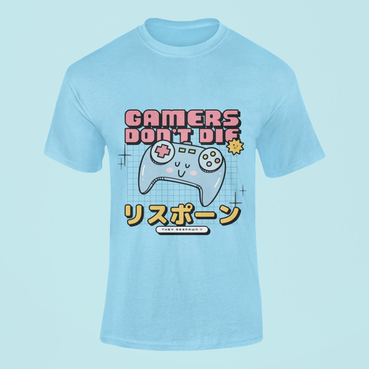 Elevate your gaming style with our enchanting sky blue cotton t-shirt that pays homage to gamers and their indomitable spirit. Featuring a charming and playful graphic, this shirt showcases a gaming joystick personified with a cute, smiling face – a design that's sure to capture the hearts of gaming enthusiasts.