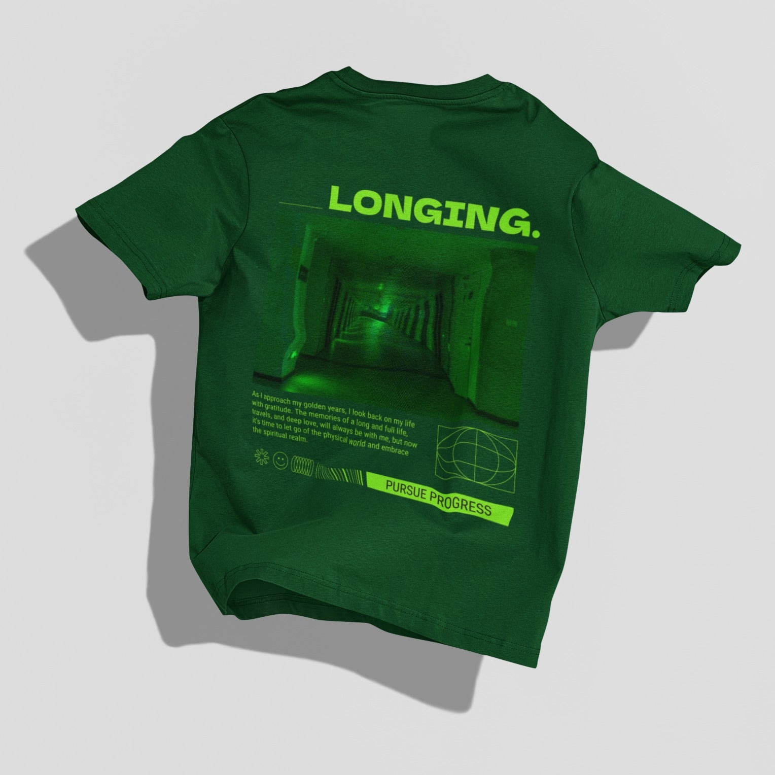 As you slip into this tee, imagine wandering through the corridors of time, each step echoing with whispers of the past and promises of the future. The captivating image of a dark corridor, accompanied by the compelling caption 'pursue progress', ignites a spark within you. It's a reminder to embrace change, to stride forward with purpose, and to never lose sight of your journey towards growth.