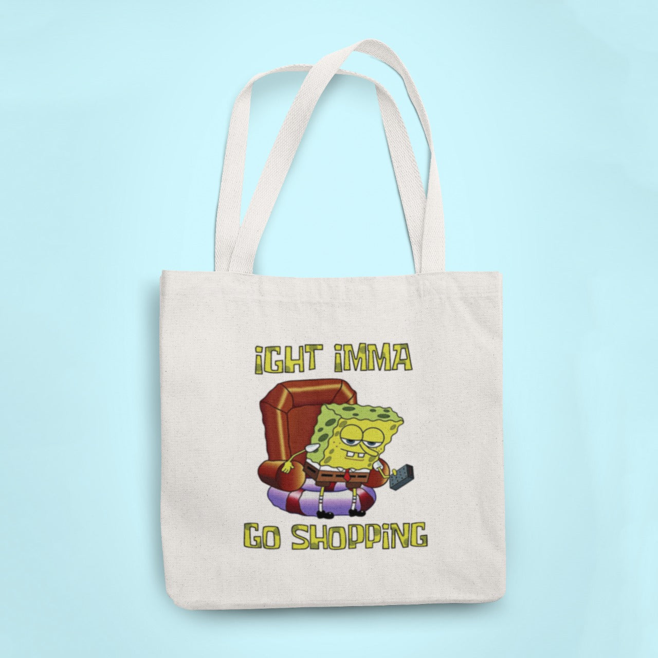 Embrace a touch of whimsy with our "SpongeBob Shopping Therapy Tote Bag," featuring a hilarious scene of SpongeBob SquarePants rising from his sofa with a remote in hand, exclaiming, "!ght imma go shopping."