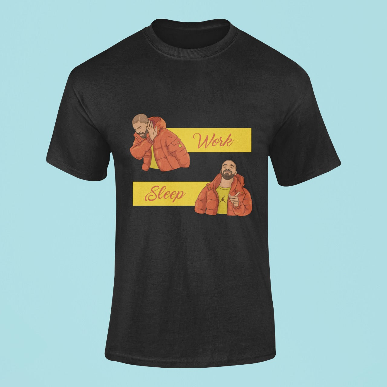 Elevate your daily style with our black round neck tee featuring the iconic "Hotline Bling" meme starring Drake. This hilarious design showcases Drake choosing "No to Work" and "Yes to Sleep." Crafted from soft and durable cotton, this tee provides both comfort and a touch of humor to your wardrobe.