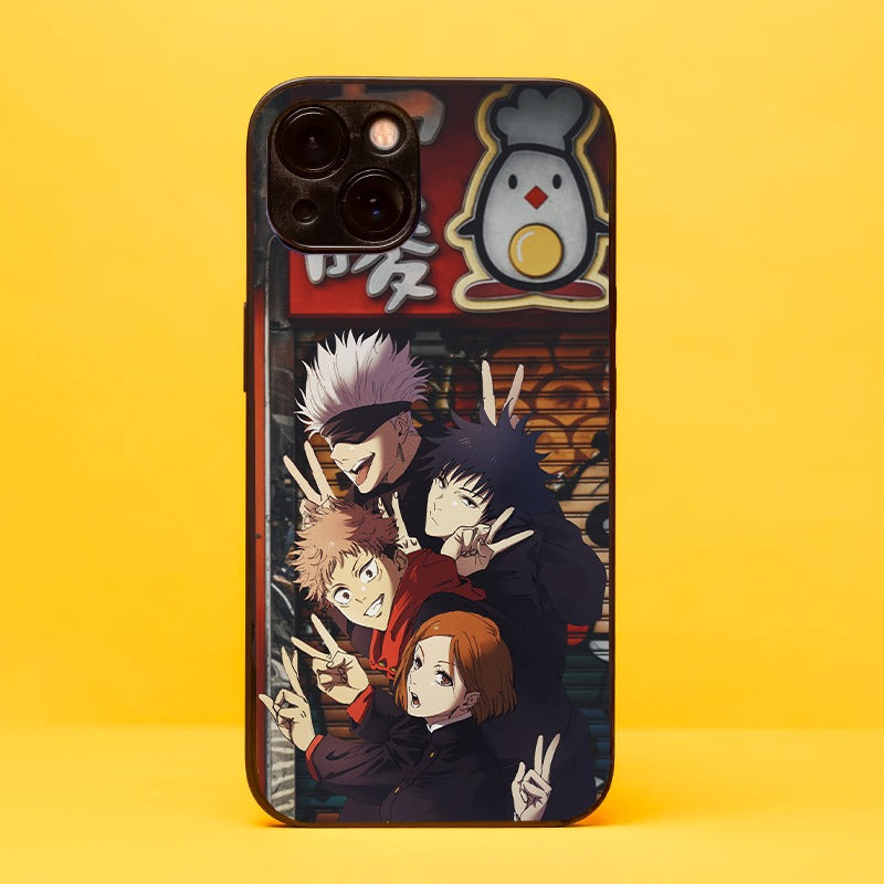 Showcase your love for Jujutsu Kaisen with this stylish and durable glass iPhone case featuring fan-favorite characters. This vibrant design captures an iconic moment with Gojo Satoru, Yuji Itadori, Megumi Fushiguro, and Nobara Kugisaki flashing peace signs, embodying their fun and adventurous spirit. Set against a colorful background with Japanese street vibes, this iPhone case is the perfect tribute to the anime's beloved cast.