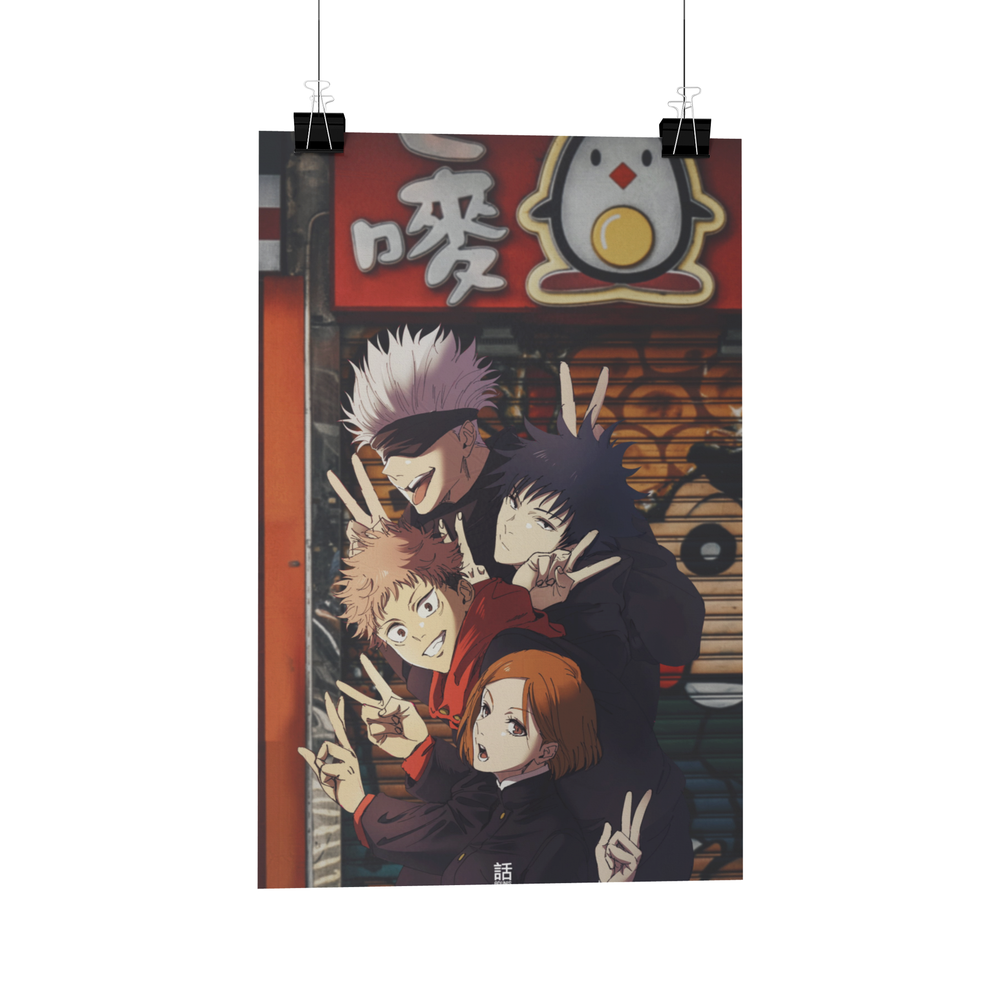 This poster is your ultimate ticket to the supernatural world of Jujutsu Kaisen, featuring none other than the main characters themselves! From top to bottom, you'll spot Gojo Satoru, Megumi Fushigoro, Itadori Yuji, and Nobara Kugisaki, all flashing the iconic victory sign like there's no tomorrow. This top-notch poster perfectly captures the essence of teamwork and epic battles beyond your wildest dreams!