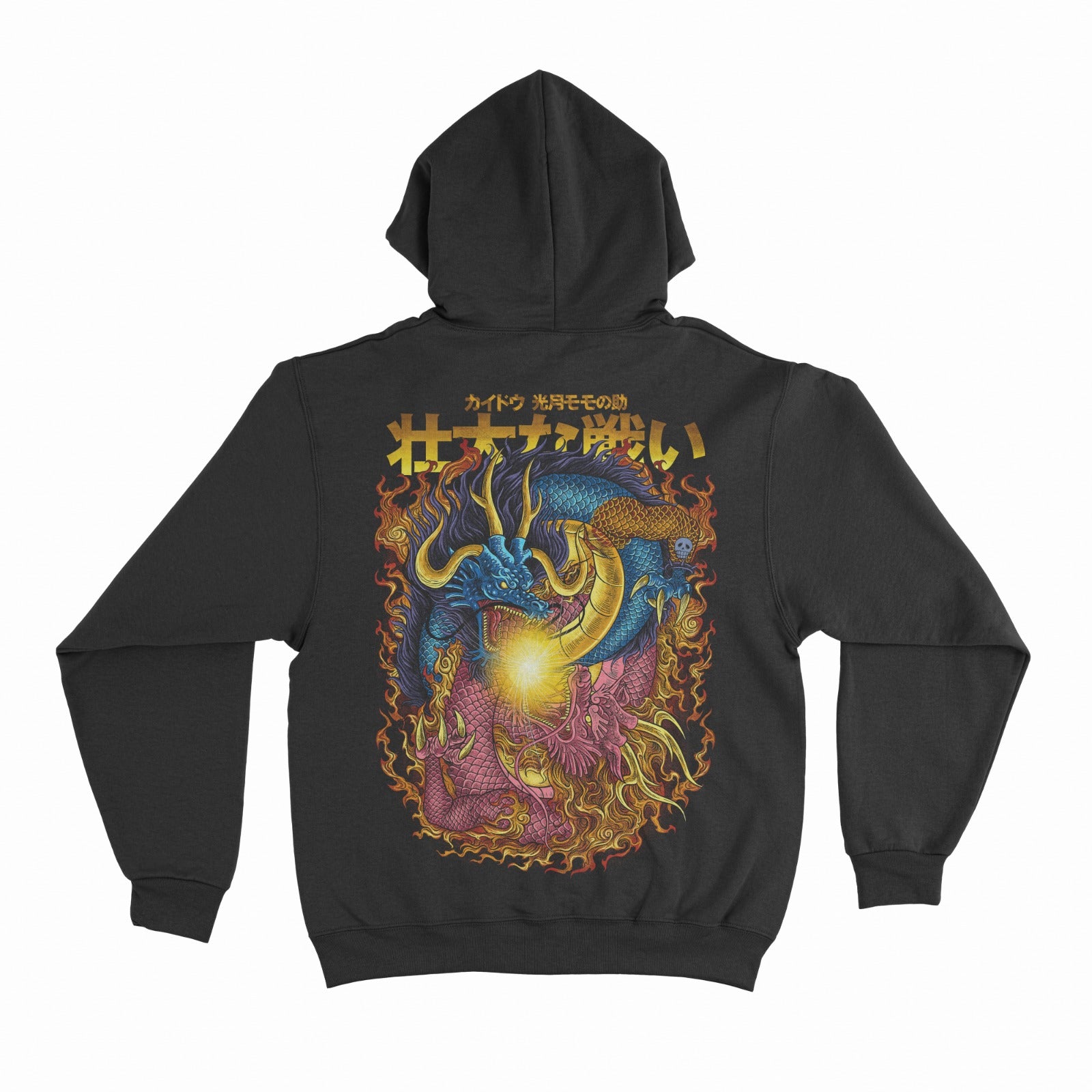 Dive into the fiery clash of dragons with our Black Kaidou vs. Kozuki Momonosuke Dragon Fight Hoodie, a mesmerizing homage to the epic battle between the Azure Dragon, Kaidou, and the Pink Dragon, Kozuki Momonosuke. The back design captures these formidable creatures locked in combat, surrounded by intense flames, creating a scene of unparalleled spectacle.