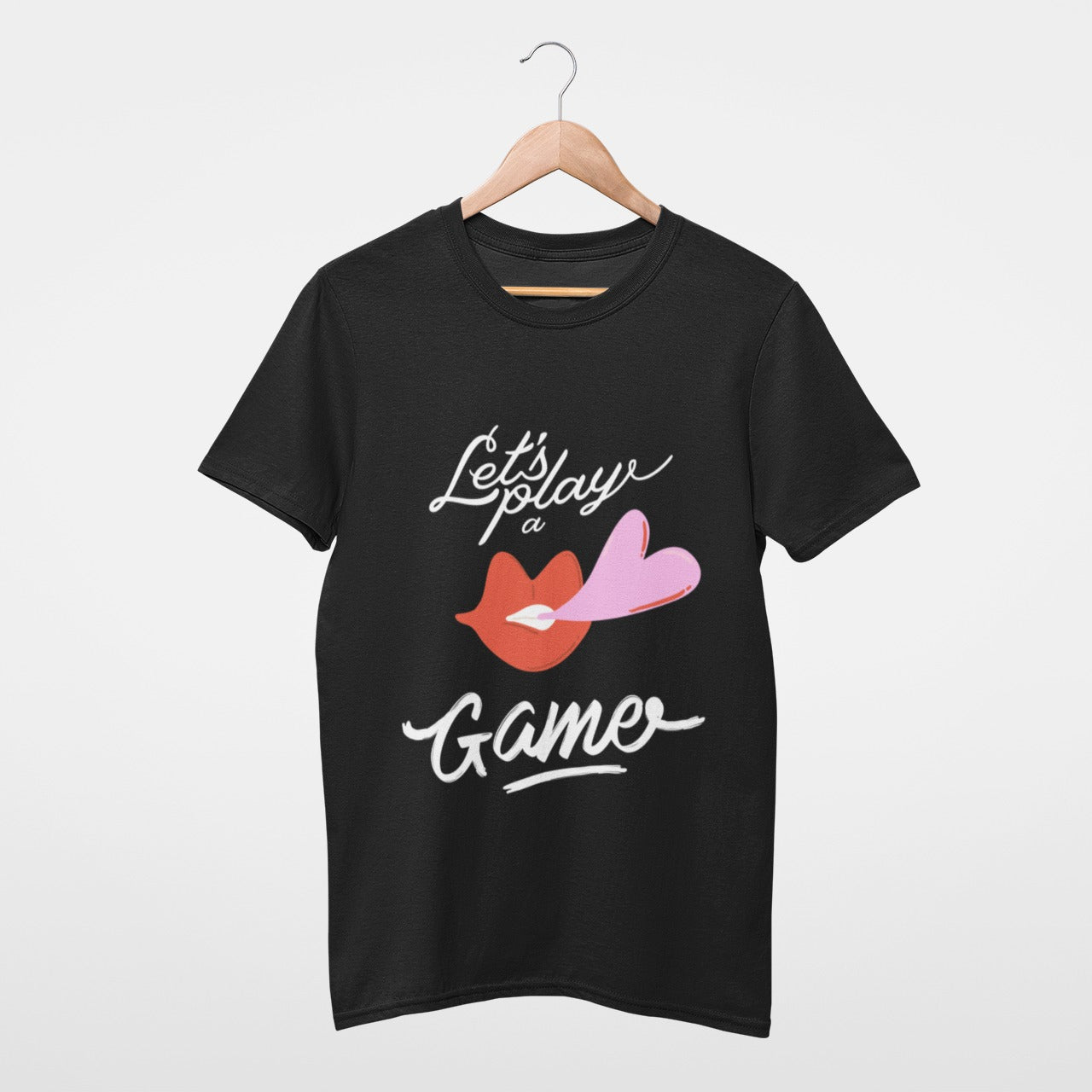 Crafted from premium black cotton, the shirt offers a snug fit and a soft feel, ensuring you stay comfortable while turning heads. The playful front graphic whispers, "Let's play a game," accompanied by an adorable image of lips giving a sweet kiss, with a heart soaring in the air. It's a cute and casual statement that's perfect for the young and the spirited.