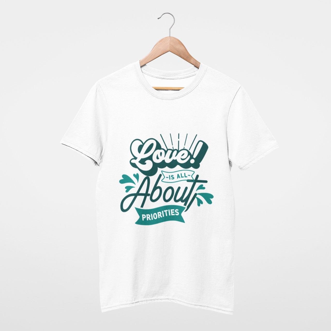 Crafted from premium white cotton, the "Priority Love" tee offers both comfort and a clean, casual style. The front graphic proudly declares, "Love is all about priorities," in a vibrant green hue, symbolizing the fresh and lively energy that love brings into our lives.