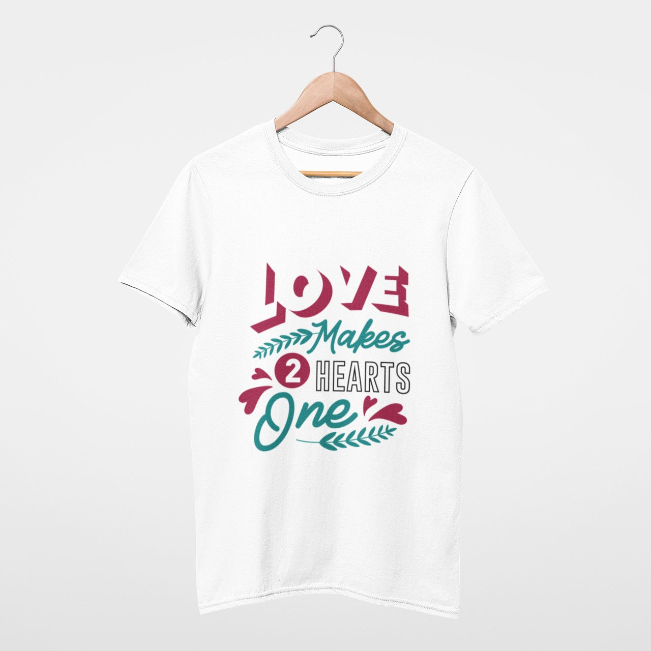Crafted from premium cotton, the "Unified Hearts" tee ensures a soft touch against your skin and a casual, stylish fit. The front graphic sweetly conveys, "Love makes 2 hearts one," in a captivating design that beautifully symbolizes the unifying force of love.