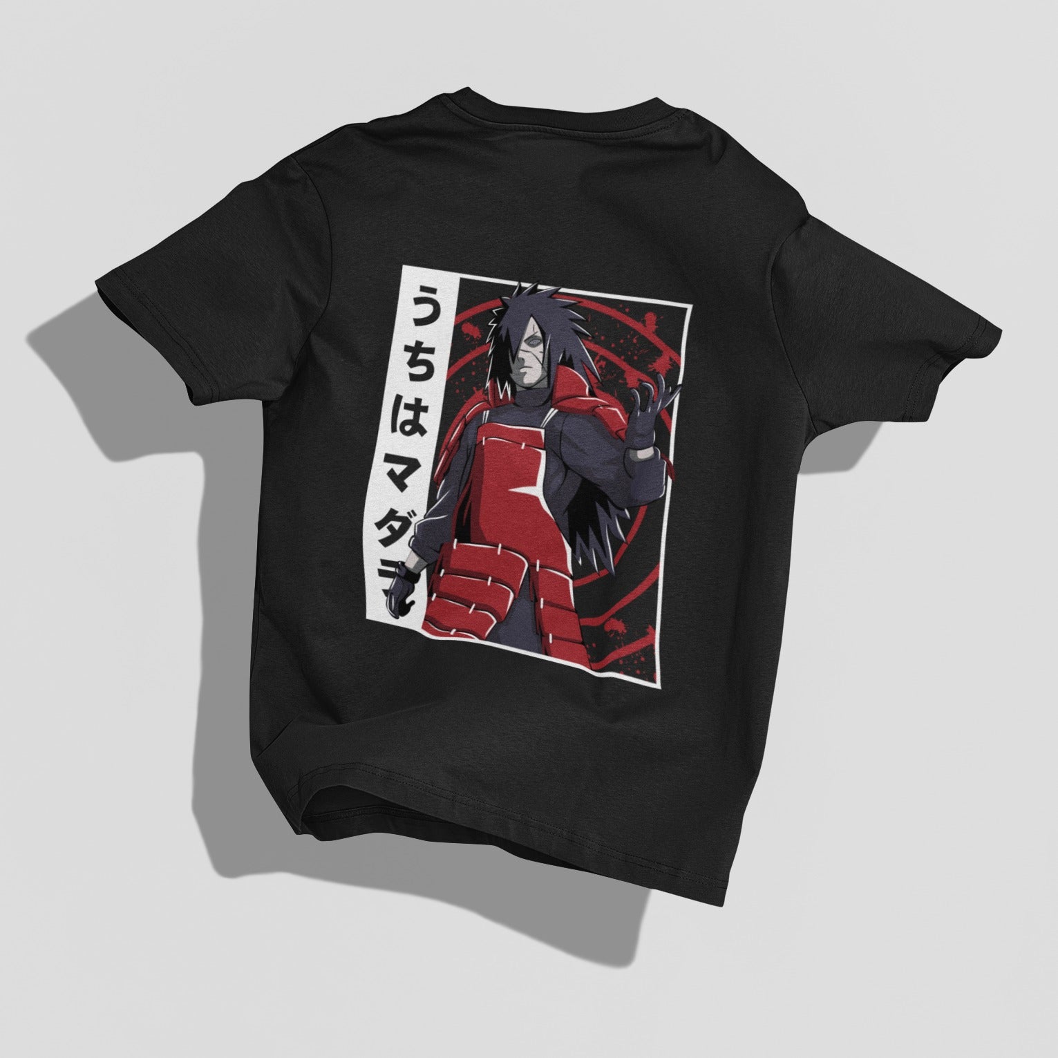 As Madara's silhouette dominates the design, the bold Japanese characters for "Madara Uchiha" in striking red add an extra layer of intensity. The oversized silhouette exudes a streetwise flair, making this tee a must-have for fans who crave both comfort and a bold nod to the shinobi universe.