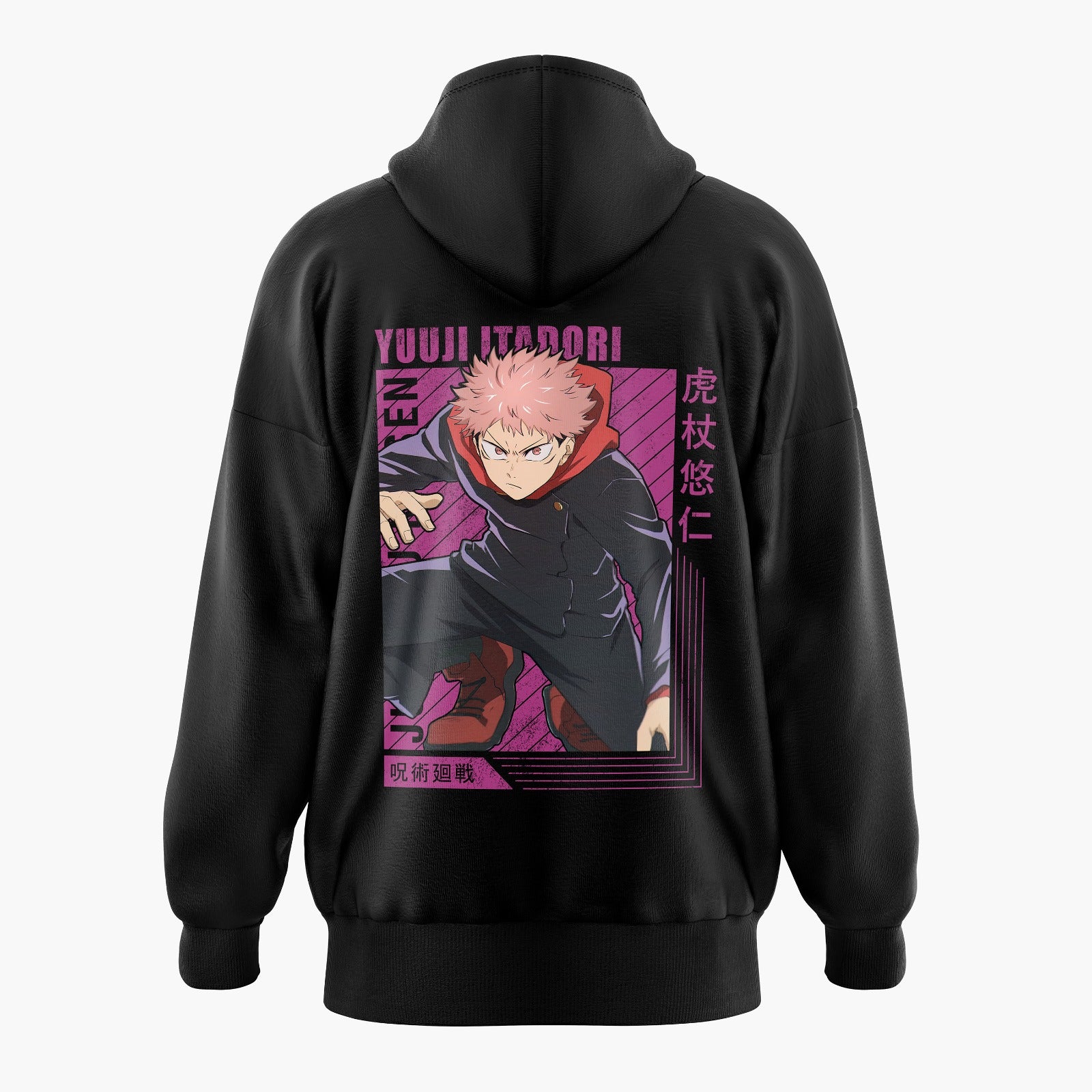 Embark on a thrilling journey through Jujutsu Kaisen's world with our Itadori Yuuji Fury Premium Oversized Hoodie, showcasing Yuuji in a fierce attacking stance. The dynamic image captures his alertness and determination against a vivid magenta background, embodying the essence of jujutsu combat.