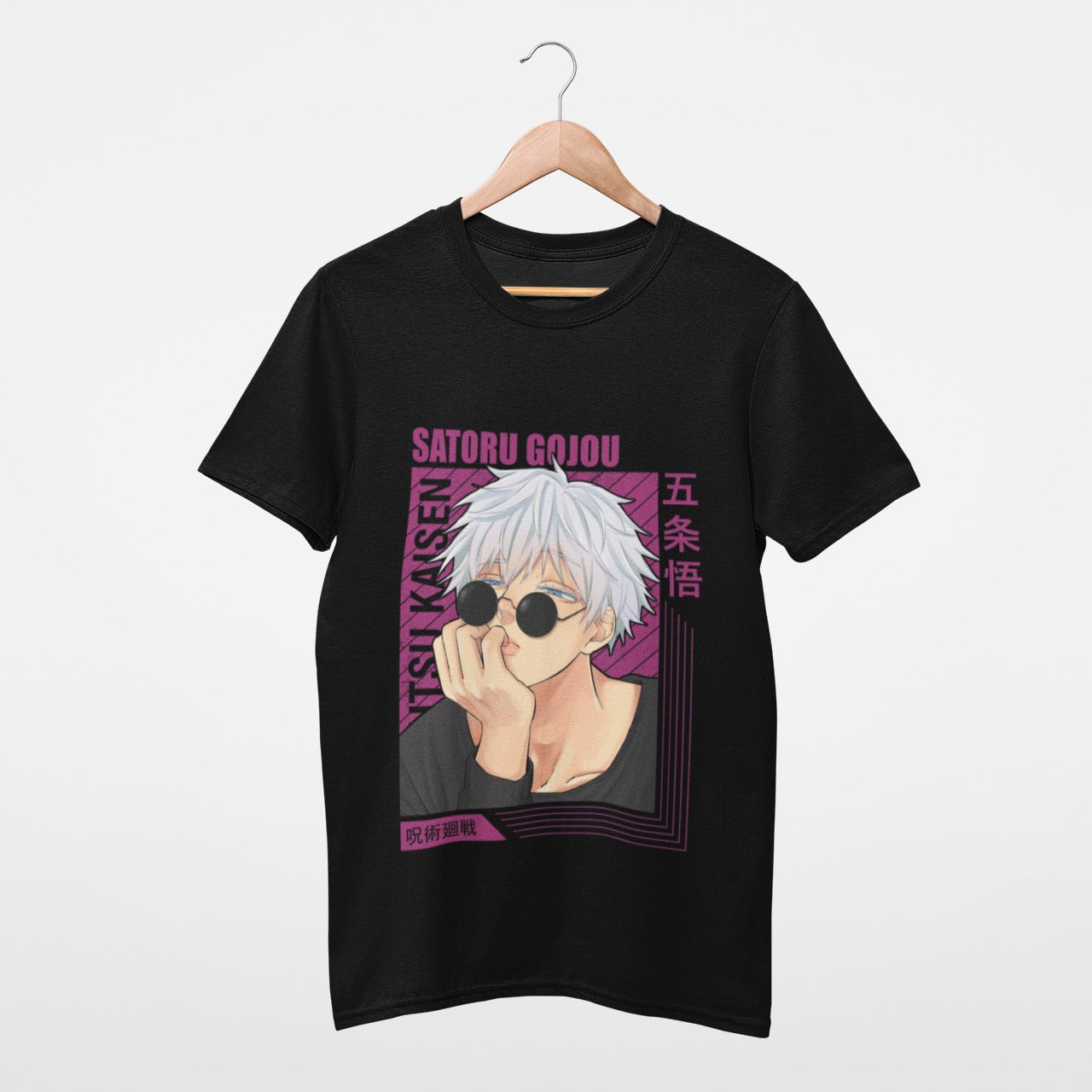 The centerpiece of this exclusive shirt is the enigmatic depiction of Gojo Satoru against a backdrop of vibrant magenta. The striking contrast between the dark tones of the character and the bold magenta background creates a visual spectacle, enhancing the overall appeal of the design. The black cotton provides an ideal canvas for the intricate details, ensuring a powerful and nuanced representation of Gojo Satoru's contemplative demeanor.
