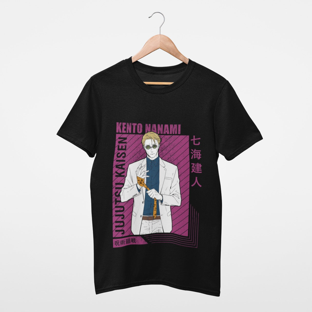 On the side of the shirt, "Jujutsu Kaisen" is boldly inscribed in magenta, resonating with the energetic theme of the design. Additionally, "Kento Nanami" is elegantly written in both English and Japanese characters in the same captivating magenta hue, adding an authentic touch that pays homage to the cultural roots of the series.
