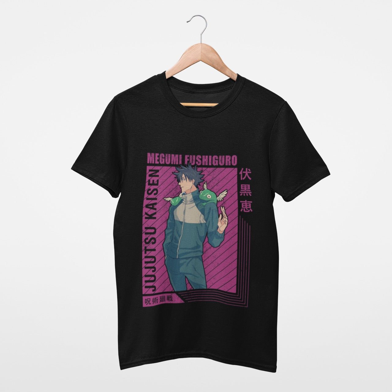 On the side of the shirt, "Jujutsu Kaisen" is prominently inscribed in magenta, resonating with the energetic theme of the design. Additionally, "Megumi Fushiguro" is elegantly written in both English and Japanese characters in the same captivating magenta hue, adding an authentic touch that pays homage to the cultural roots of the series.