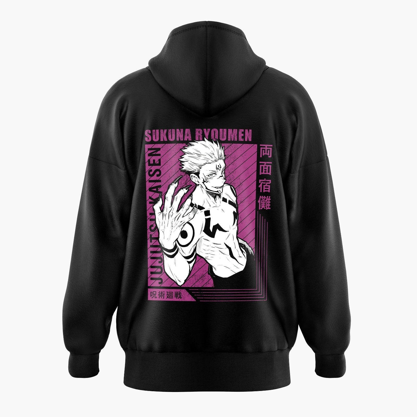 Expressing malevolence and dark allure, "Sukuna Ryoumen" and "Jujutsu Kaisen" are boldly inscribed in magenta, both in English and Japanese characters. Crafted from top-tier materials, our Black Oversized Hoodie guarantees the perfect blend of comfort and style. The oversized fit provides a relaxed and contemporary look, ideal for showcasing your love for anime with a touch of dark authority.