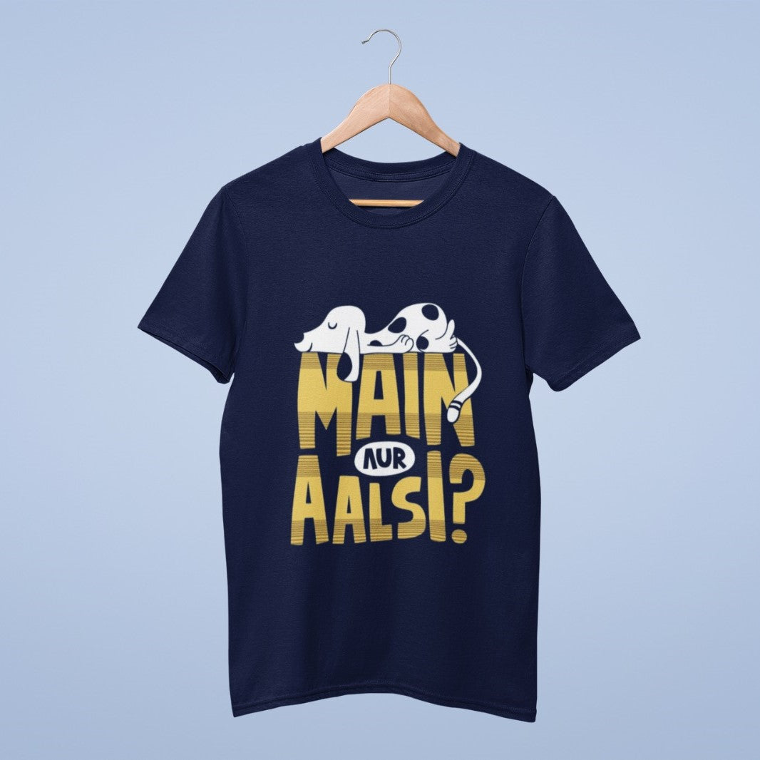 Revamp your wardrobe with our Navy Blue Round Neck T-shirt, designed to infuse humor and style into your everyday wear. Featuring the witty text "Main Aur Aalsi?" (Me and Lazy?) accompanied by a charming dog peacefully snoozing on top, this tee captures a delightful essence of laid-back humor. Crafted from premium navy blue cotton, it ensures superior comfort and durability. Whether you're a dog enthusiast or just enjoy witty fashion, this shirt lets you express your personality with a smile. Stand out from the crowd, embrace your playful side, and let your clothing do the talking. Upgrade your fashion game with this unique tee, a perfect blend of comfort, style, and humor.