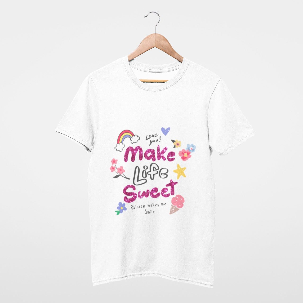 The front graphic boasts a delightful composition, with the endearing phrase "love you!" adorning the top, followed by the cheerful message "rainbow makes me smile" at the bottom. In the center, the empowering statement "Make life sweet" shines brightly in bold, glittering magenta, capturing the essence of living life to the fullest.