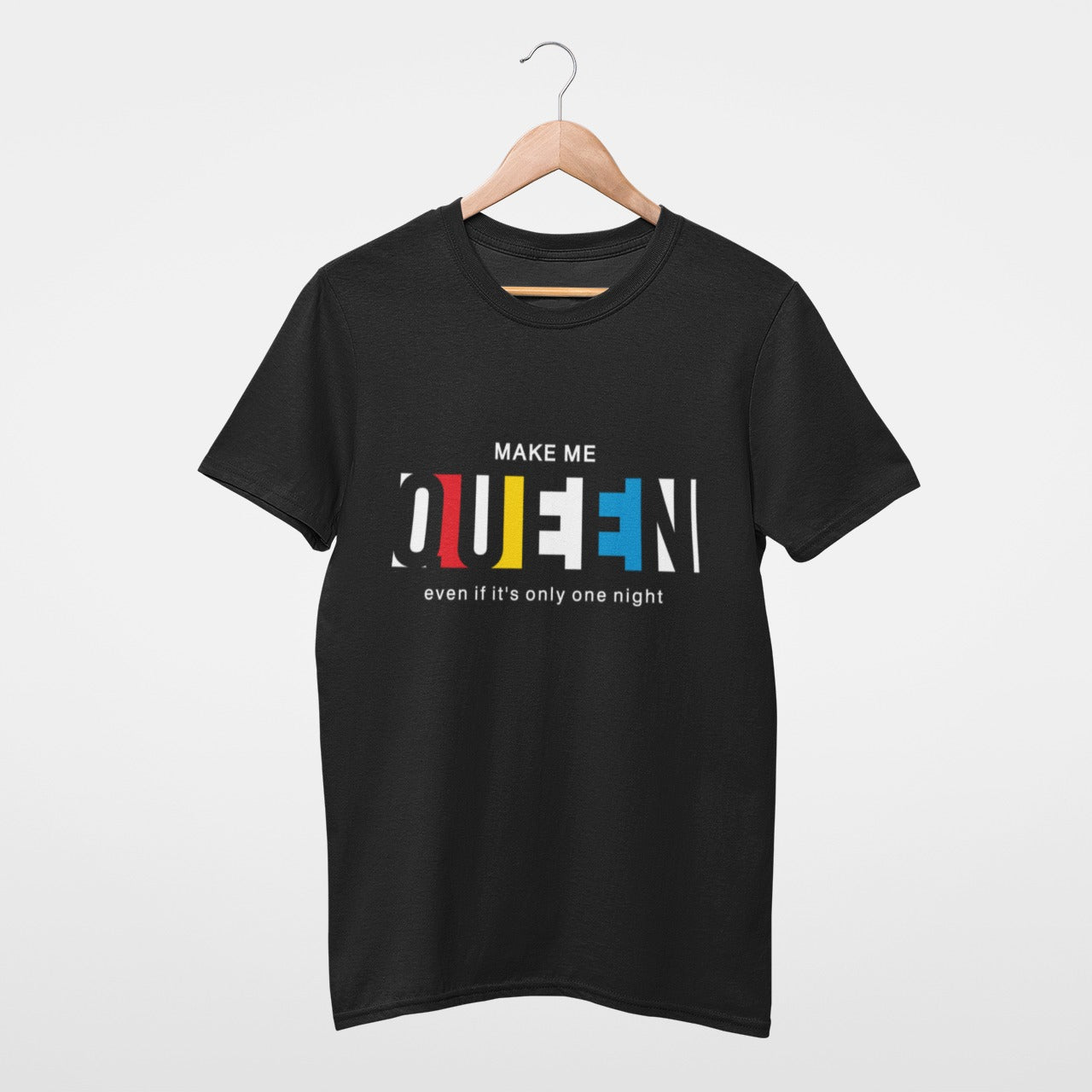 The front graphic features the bold phrase "Make Me QUEEN, Even if It's Only One Night," celebrating the spirit of empowerment and individuality. With its captivating design, this tee invites you to embrace your inner royalty and shine bright, whether it's for one night or every day.