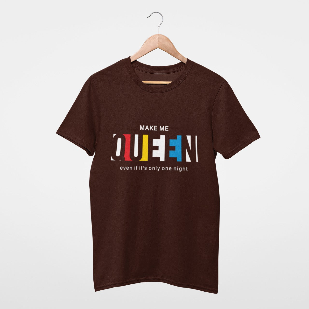 Introducing our captivating and empowering "Make Me QUEEN, Even if It's Only One Night" Cotton T-shirt, available in a range of stunning colors including black, red, brown, and navy blue. Crafted from premium quality cotton, this tee is more than just a piece of clothing – it's a statement of confidence, allure, and the undeniable power of self-expression.