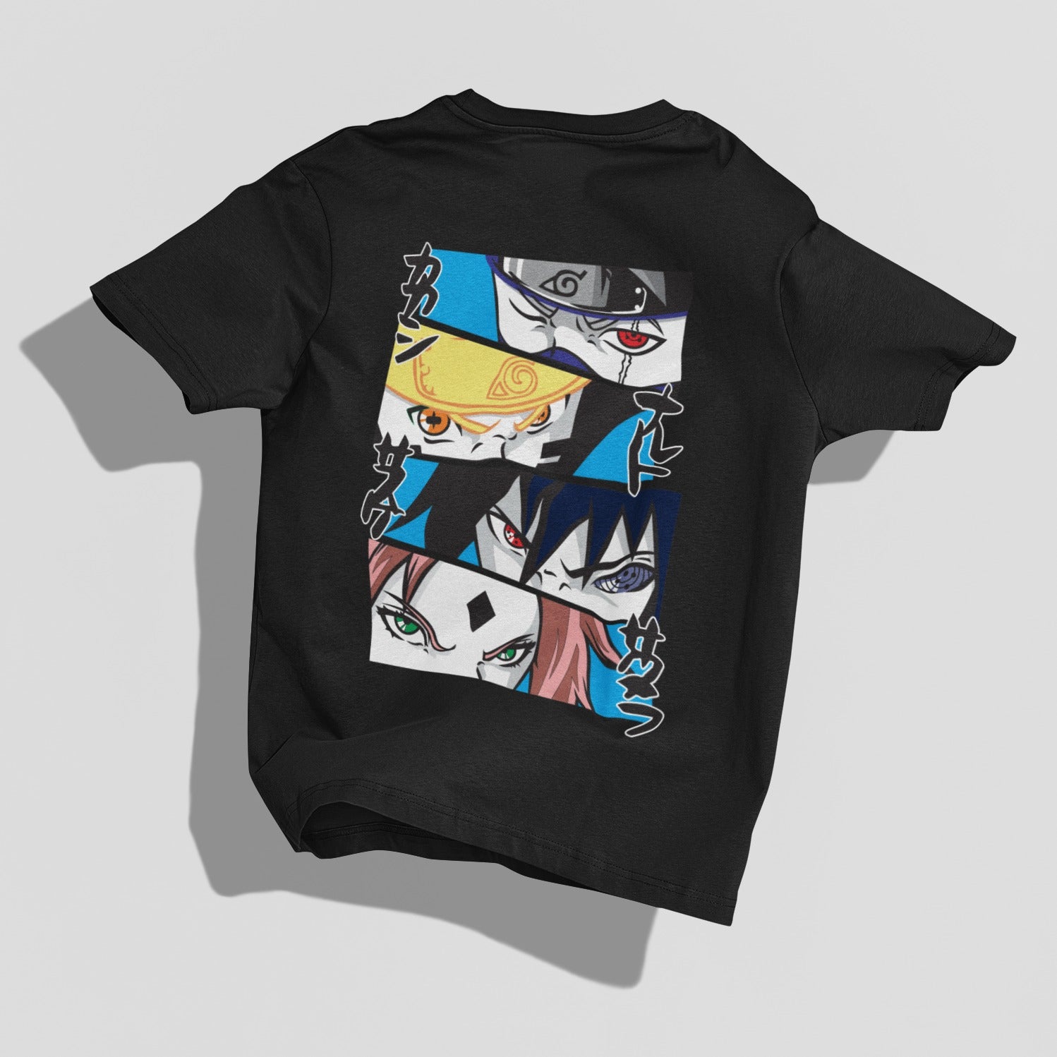 As Kakashi, Naruto, Sasuke, and Sakura align in a row, the design exudes an urban flair that captures the essence of the Hidden Leaf Village's legendary team. The oversized silhouette adds an extra layer of streetwise style, making this tee a must-have for fans who crave both comfort and a bold nod to the Naruto universe.
