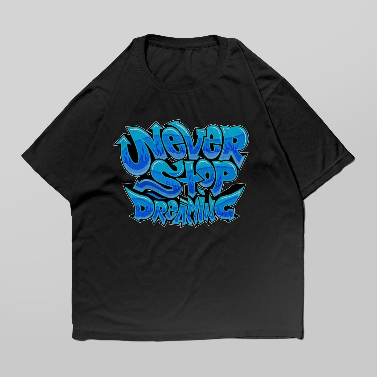 Step into the world of unbridled creativity with our Black Cotton Oversized T-shirt, boldly declaring "NEVER STOP DREAMING" in vibrant, bright blue graffiti style. Crafted from premium black cotton, this oversized tee isn't just a garment; it's a manifesto for those who dare to dream and refuse to conform.