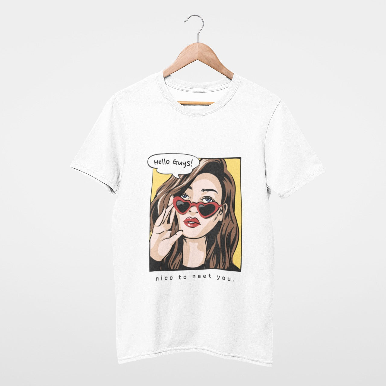 The front graphic is not just eye-catching; it's a conversation starter. Featuring a whimsical illustration of a woman sporting heart-shaped goggles, she greets the world with a friendly "Hello Guys! Nice to Meet You," exuding warmth and approachability. This playful design adds a dash of fun and personality to your everyday look, making you stand out from the crowd with effortless charm.