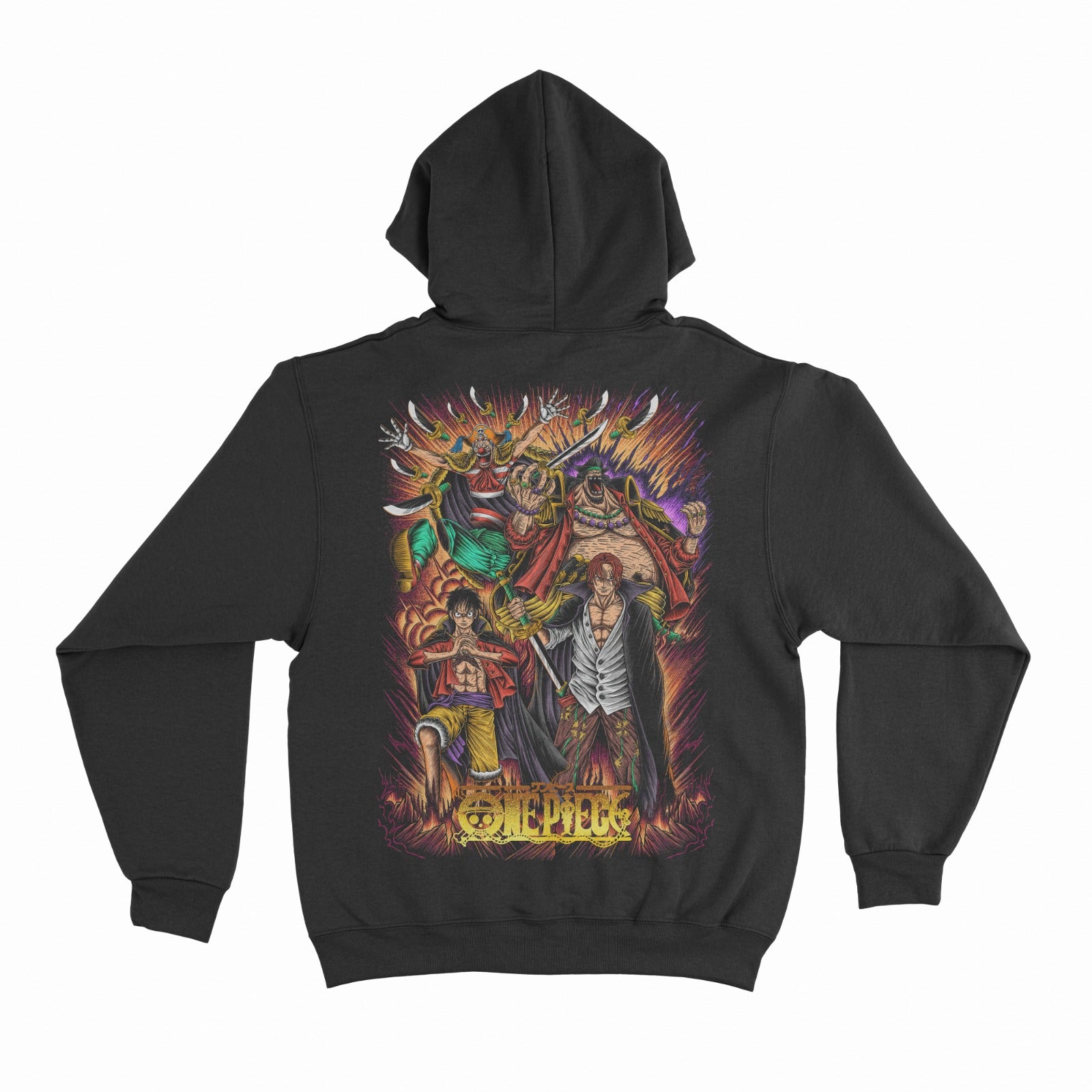 Crafted with meticulous attention to detail, this hoodie isn't just apparel; it's a visual celebration of the evolving power dynamics in the world of One Piece. The striking black backdrop provides the perfect canvas for this intense design, making it a versatile and bold addition to your daily wardrobe.
