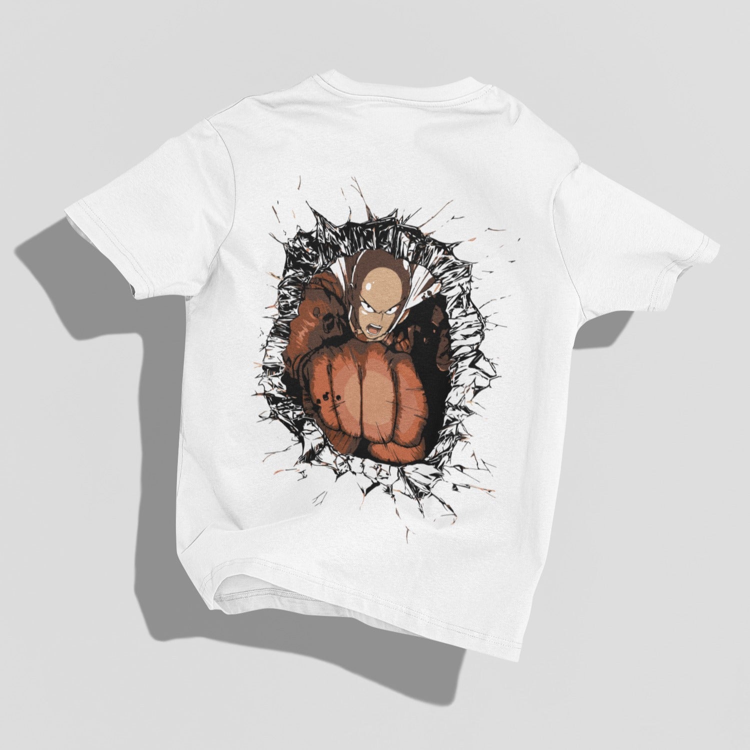 Introducing the White Oversized Saitama T-shirt from the STATIC Store, perfect for anime lovers and streetwear enthusiasts alike. Featuring an electrifying design of Saitama, the iconic hero from One Punch Man, this t-shirt showcases him breaking through a shattered wall, symbolizing his unbeatable strength and effortless power. The high-quality graphic on the back makes a bold statement, capturing the essence of anime action.