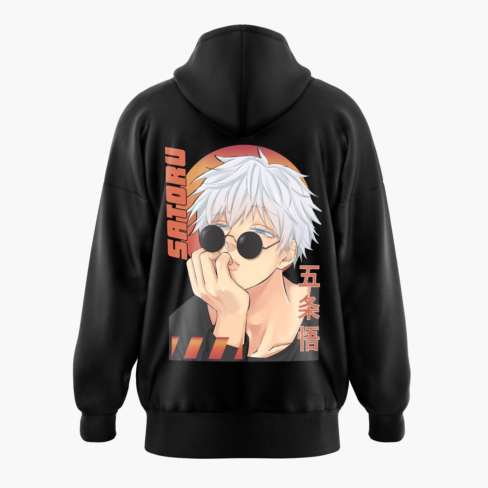 Embark on a radiant journey with our Gojo Satoru Sun-Kissed Premium Oversized Hoodie, featuring the enigmatic sorcerer in a contemplative moment against a vibrant orange sun backdrop. "Satoru" is elegantly inscribed in orange on the side, and "Gojo Satoru" is written in Japanese characters in the same warm hue.