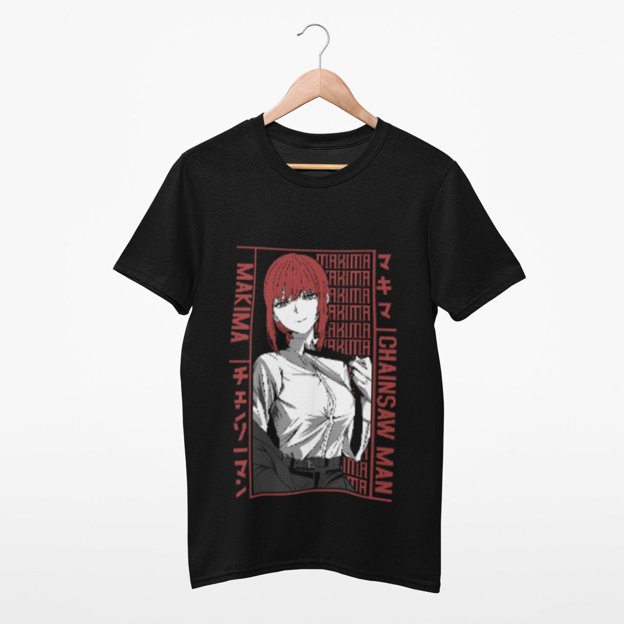 Carefully crafted from premium black cotton, this T-shirt provides a luxurious and breathable feel, ensuring both comfort and durability. The striking image of Makima takes center stage, portraying her strength and allure alongside her loyal companion, Chainsaw Man. The background features a subtle repetition of the name "Makima" in a pale auburn hue, mirroring her distinctive hair color. This artistic touch adds depth to the design, creating a visually stunning and unique aesthetic.