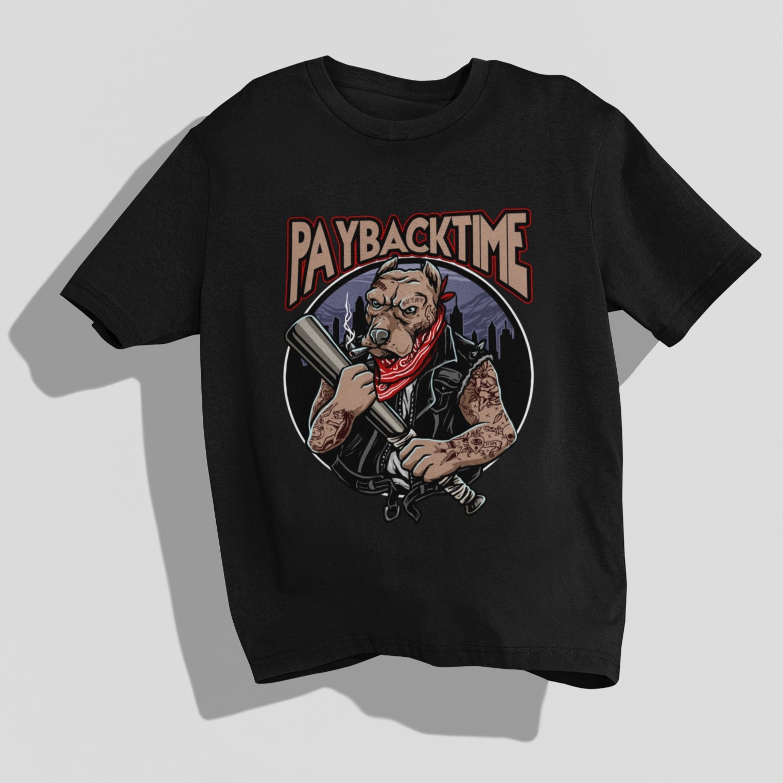 Unleash the canine rebellion with our Black Cotton Oversized T-shirt – a bold fusion of street swagger and four-legged attitude. The front design features a bulldog dressed like a thug, sporting a leather jacket, tattooed hands gripping a baseball bat, and casually puffing on a cigarette. With the title "PAYBACK TIME" emblazoned in bold, this tee isn't just clothing; it's a declaration of canine coolness.