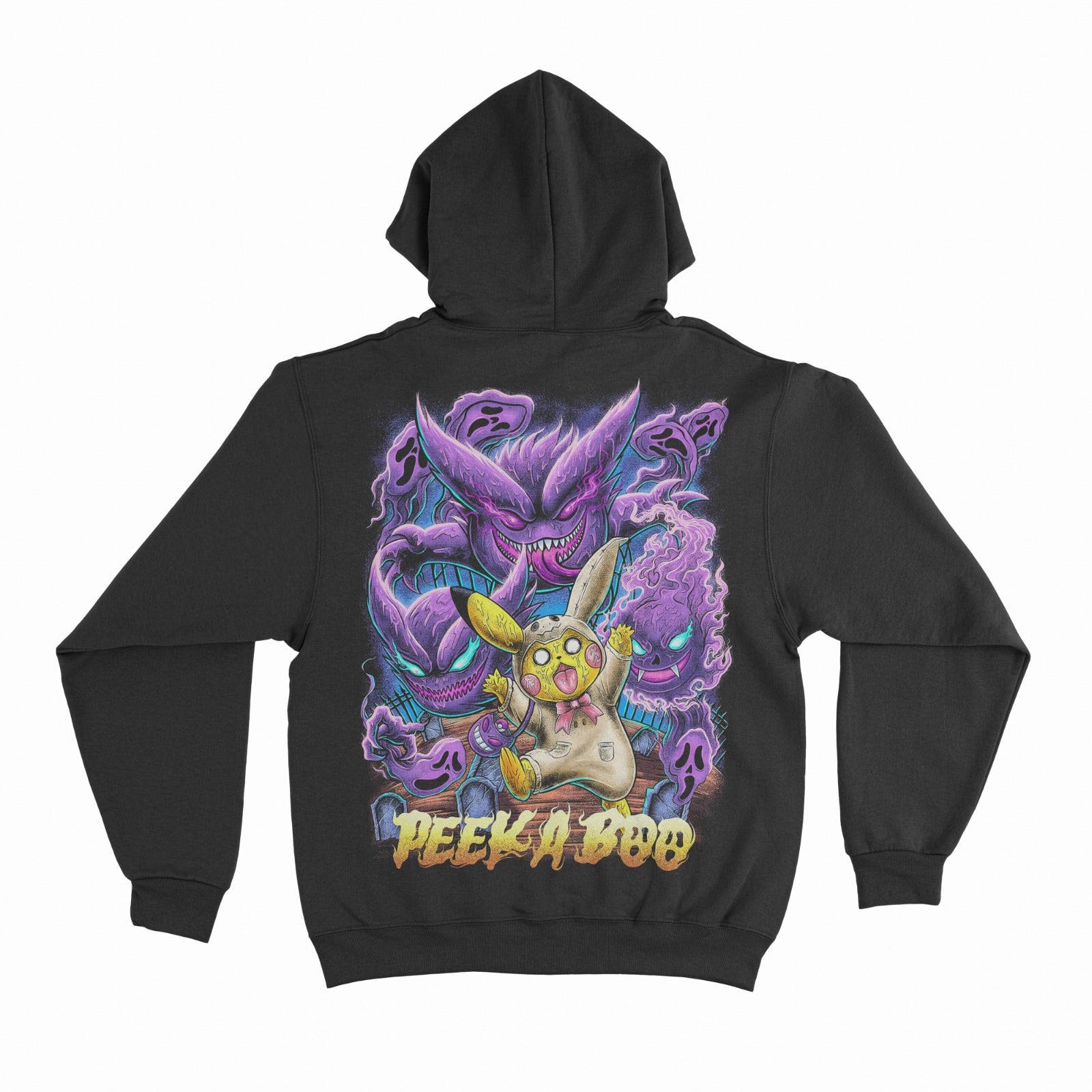 In bold electrifying letters, the title "Peek a boo" completes the hoodie, enhancing the playful and mischievous theme. Crafted with meticulous attention to detail, this hoodie is not just a piece of clothing; it's a celebration of Halloween with a beloved Pokémon twist.