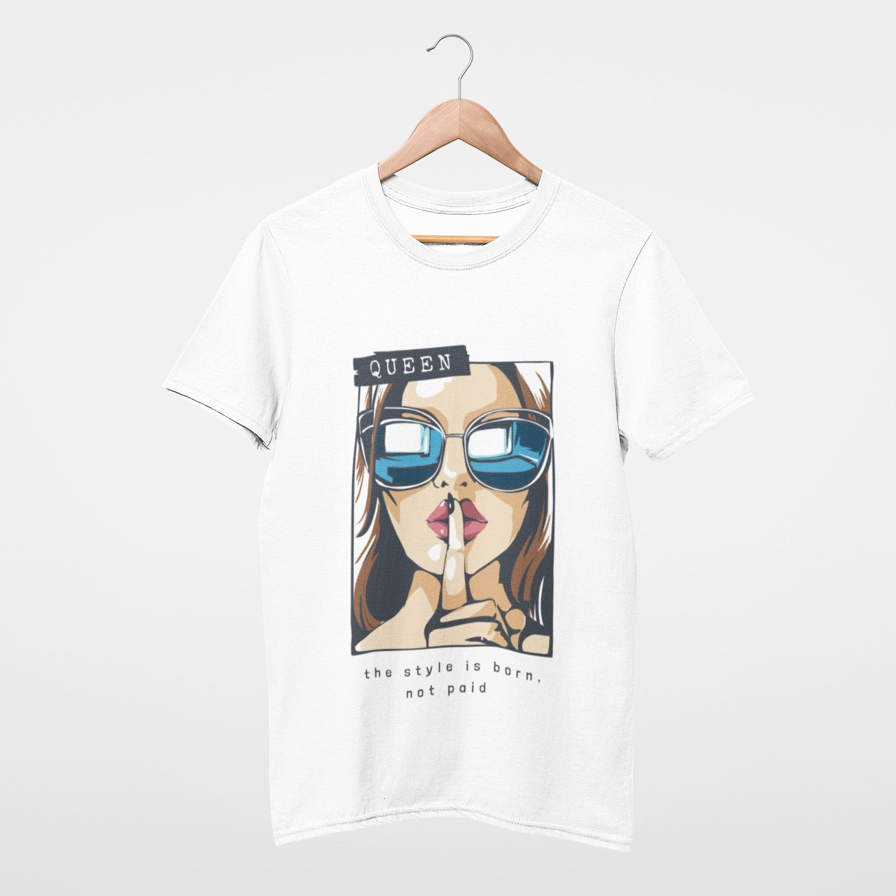 The front graphic showcases a girl wearing shades, with a finger placed delicately on her lips, radiating an air of confidence and mystery. The title "QUEEN" boldly proclaims her regal status, while the caption "the style is born, not paid" reinforces the idea that true style comes from within and cannot be bought.