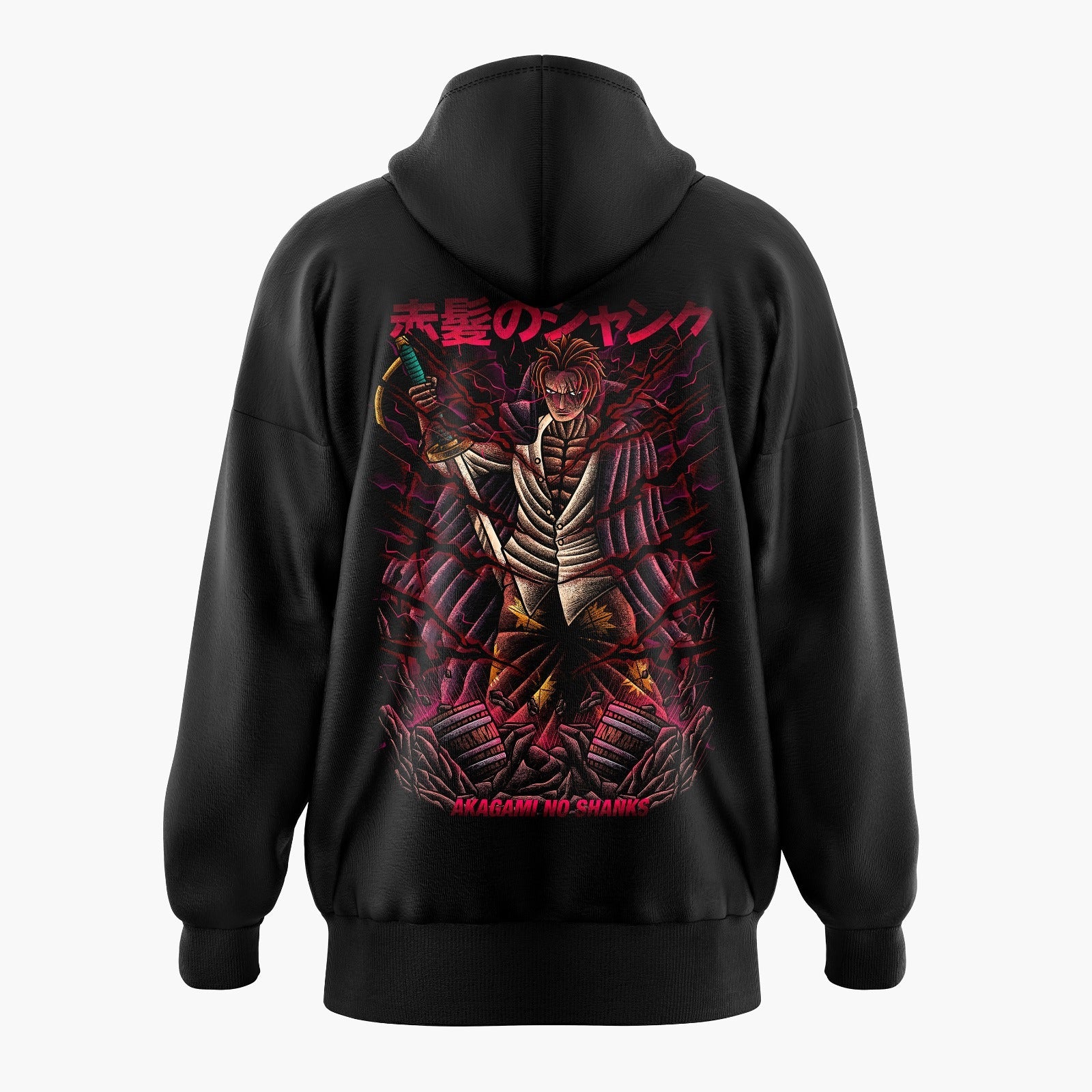 Dive into the world of power and dominance with our exclusive Red Hair Shanks Oversized Hoodie, capturing the essence of this legendary figure. The back design showcases Shanks in a menacing look, unsheathing his sword Gryphon, and emanating the overwhelming aura of Conqueror's Haki. At the top, "Red Hair Shanks" is boldly inscribed in Japanese characters in striking black and red hues, while at the bottom, "Akagami no Shanks" adds an extra layer of regality, creating a hoodie that commands attention and respect.