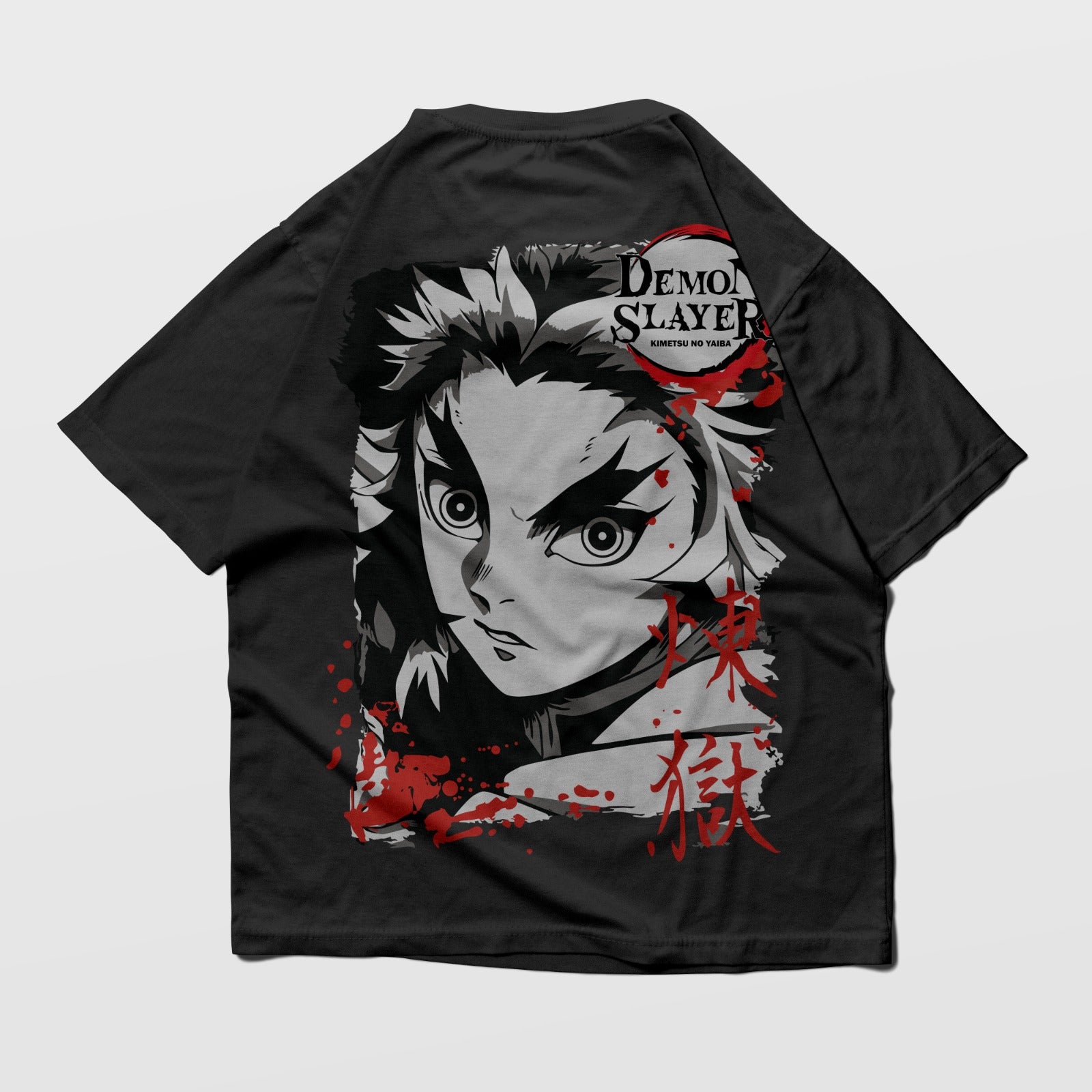 Ignite your style with the Black Cotton Oversized T-shirt, featuring a mesmerizing close-up of Rengoku Kyojuro's face, the Flame Hashira from Demon Slayer. Crafted from premium black cotton, this oversized tee isn't just clothing; it's a dynamic canvas that captures the intensity and unwavering determination of the Flame Hashira.