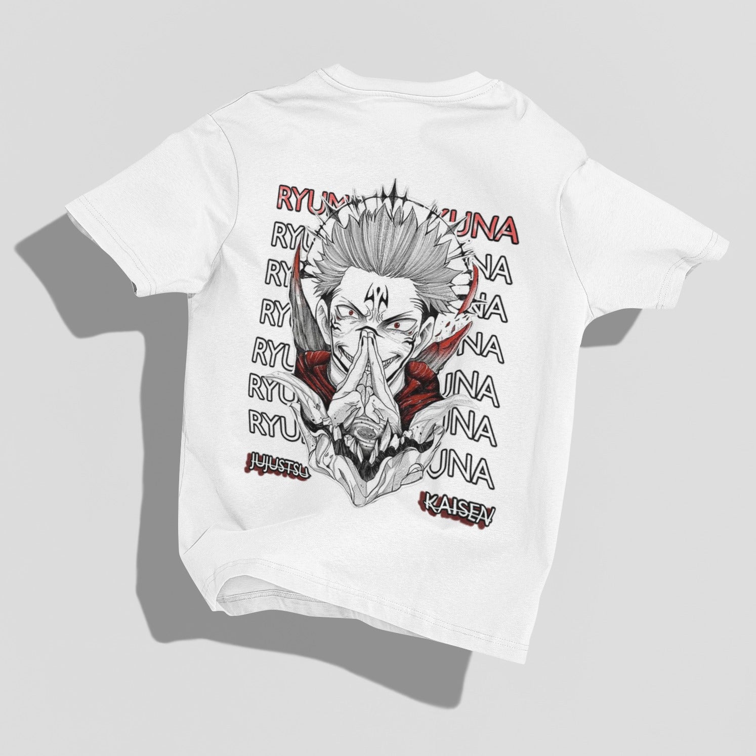 Unleash your inner curse with the Ryomen Sukuna White Oversized T-shirt from the STATIC Store, perfect for fans of Jujutsu Kaisen. Featuring a striking graphic of the King of Curses, Sukuna, in a bold, red-accented design, this tee radiates dark energy and intense anime vibes. The intricate artwork captures Sukuna’s menacing aura, with his iconic hand gesture and demonic expression front and center.