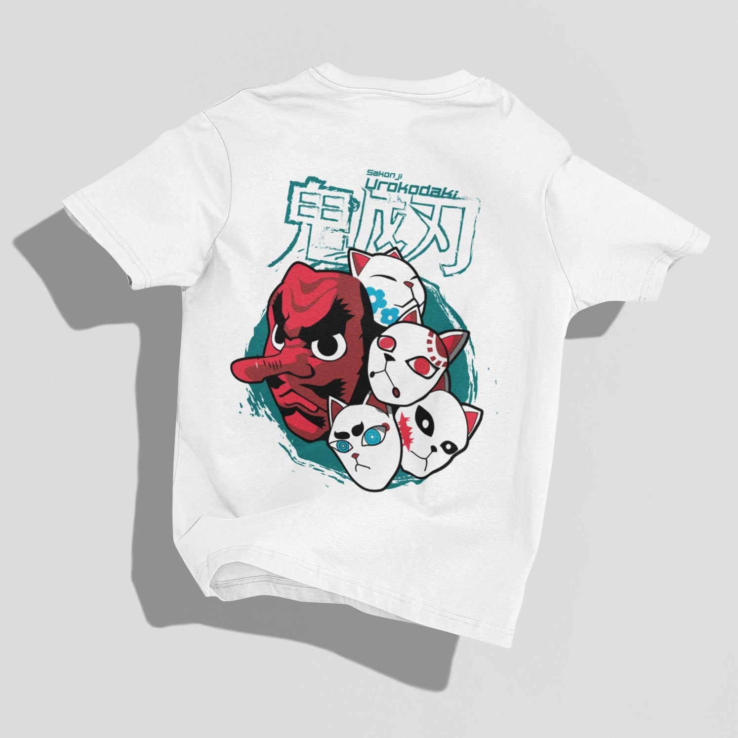 The Tengu mask, adorned with intricate details, takes center stage on the back design, creating an edgy and mystifying visual appeal. In an extra touch of coolness, "Sakonji Urokodaki" is boldly written in both English and Japanese characters, grounding the design in the ethereal world of Demon Slayer.