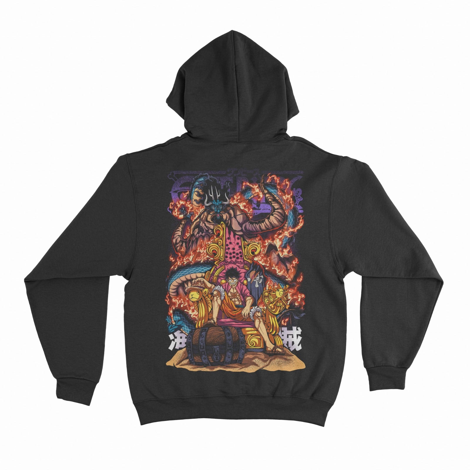 Whether you're a dedicated fan of One Piece or someone who appreciates dynamic and powerful designs, this hoodie is a must-have. Order our Pirate King's Throne Hoodie today and wear the emblem of Luffy's indomitable spirit. With Luffy atop the Empty Throne and the presence of Kaidou, you'll be ready to conquer your day with style and the enduring essence of the Grand Line. Elevate your wardrobe with this iconic and visually stunning hoodie, available for delivery in India.