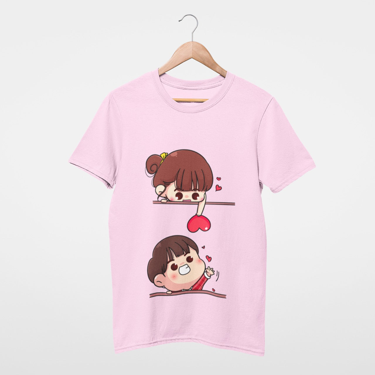 Crafted from soft pink cotton, this shirt embraces comfort and cuteness. The front graphic showcases a cute cartoon girl perched on a ledge, sweetly sharing a heart with a cartoon guy on a lower ledge. It's a visual celebration of love, friendship, and those whimsical moments that make life memorable.