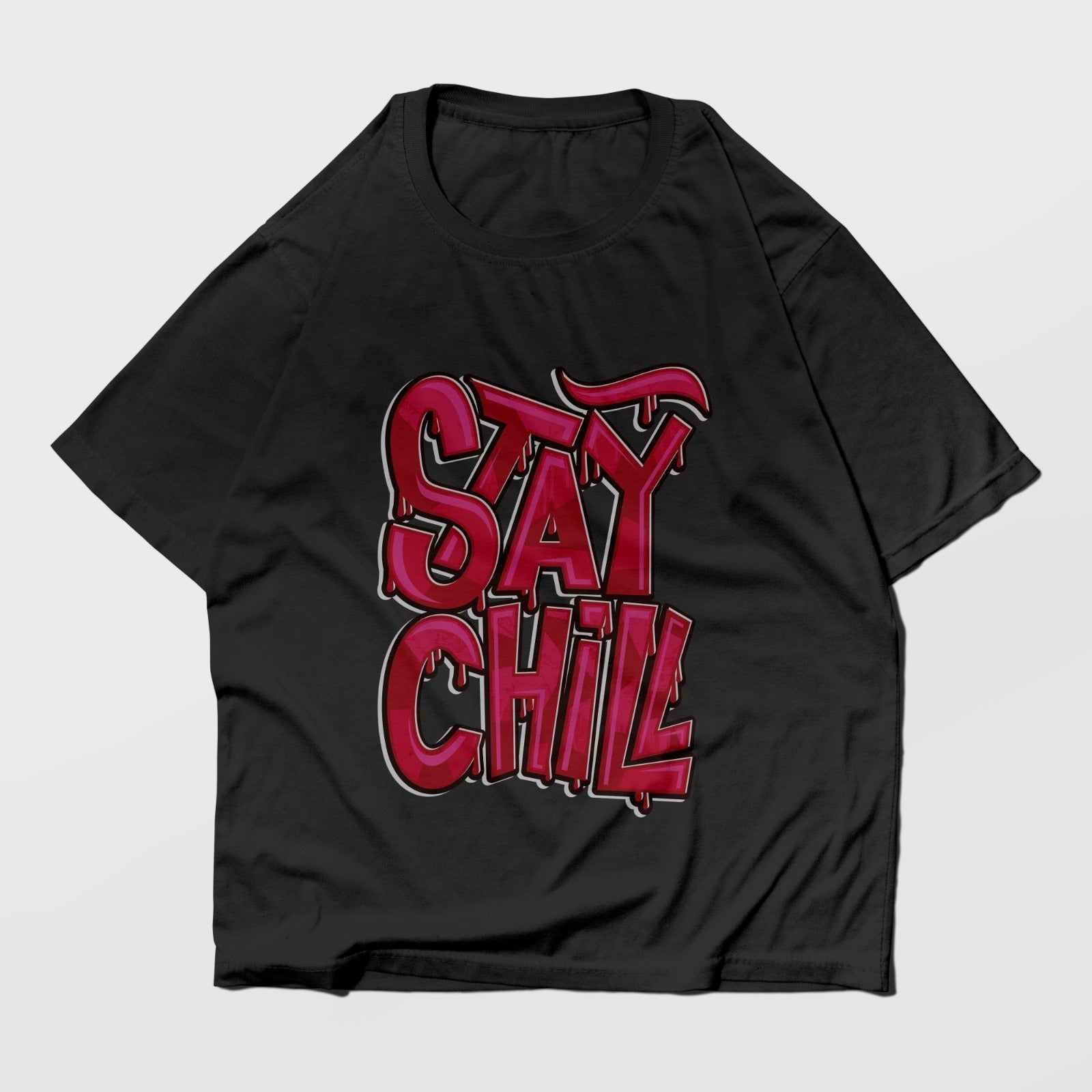The vibrant magenta hues of "STAY CHILL" add a pop of rebellious energy, creating a visual masterpiece that resonates with the young and the bold. The graffiti style adds an extra layer of streetwise flair, making this tee a must-have for those who know how to keep it cool in any situation.