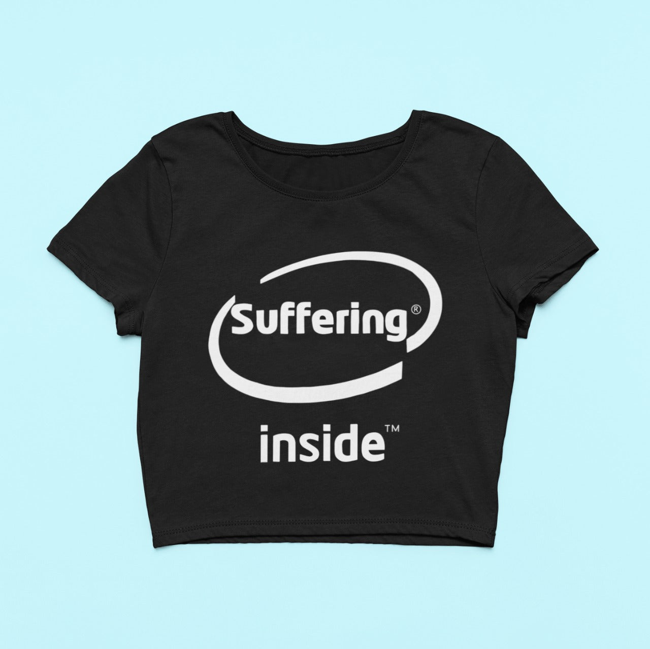 Revamp your casual style with our black cotton crop top featuring the iconic "Suffering Inside" design. This playful graphic, inspired by a popular meme and the well-known Intel Inside logo, brings a unique blend of humor and style to your wardrobe. Crafted from premium cotton, this crop top ensures both comfort and laughter, making it a must-have for your laid-back collection.