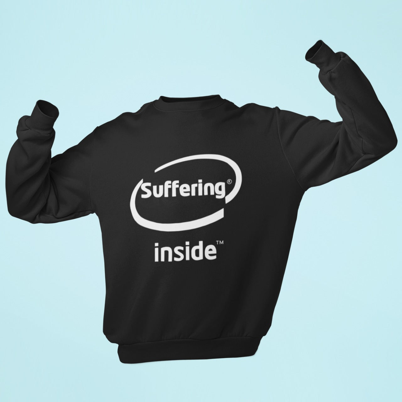 Elevate your fashion game with our black sweatshirt featuring the "Suffering Inside" design – a playful fusion of a viral meme with the iconic Intel Inside logo. Crafted from premium materials, this sweatshirt caters to those who crave a stylish edge paired with a generous dose of humor. Whether you're hanging out with friends or exploring online communities, express your passion for internet culture and make a bold statement.
